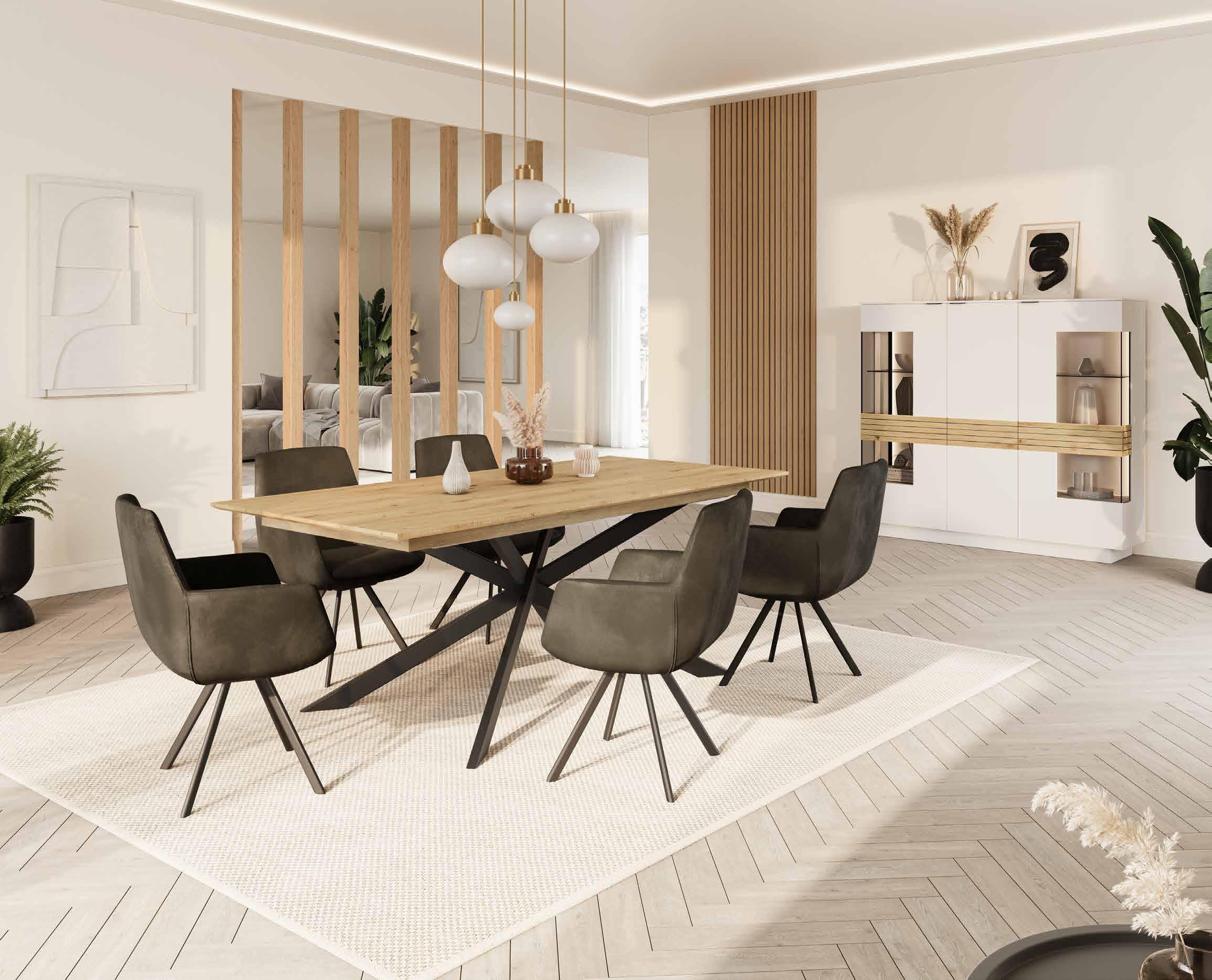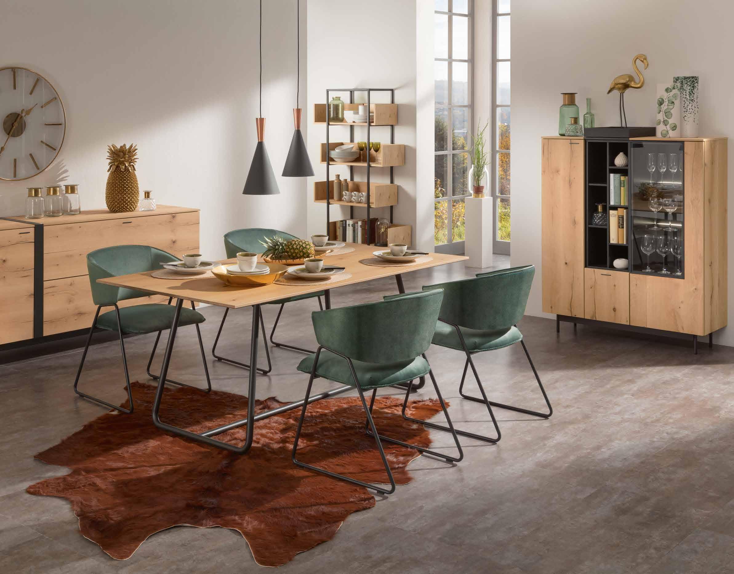 Der moderne Tisch in Balkeneiche Natur und Metallgestell ist ein Highlight in jedem Wohnraum. Passend dazu die Stühle STYLE mit geschwungenem Rücken als gekonnter Stilbruch zum geradlinigen Tisch.