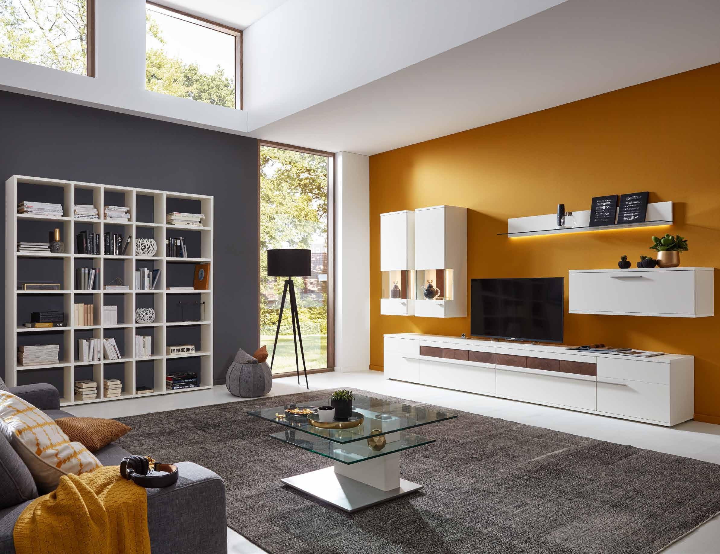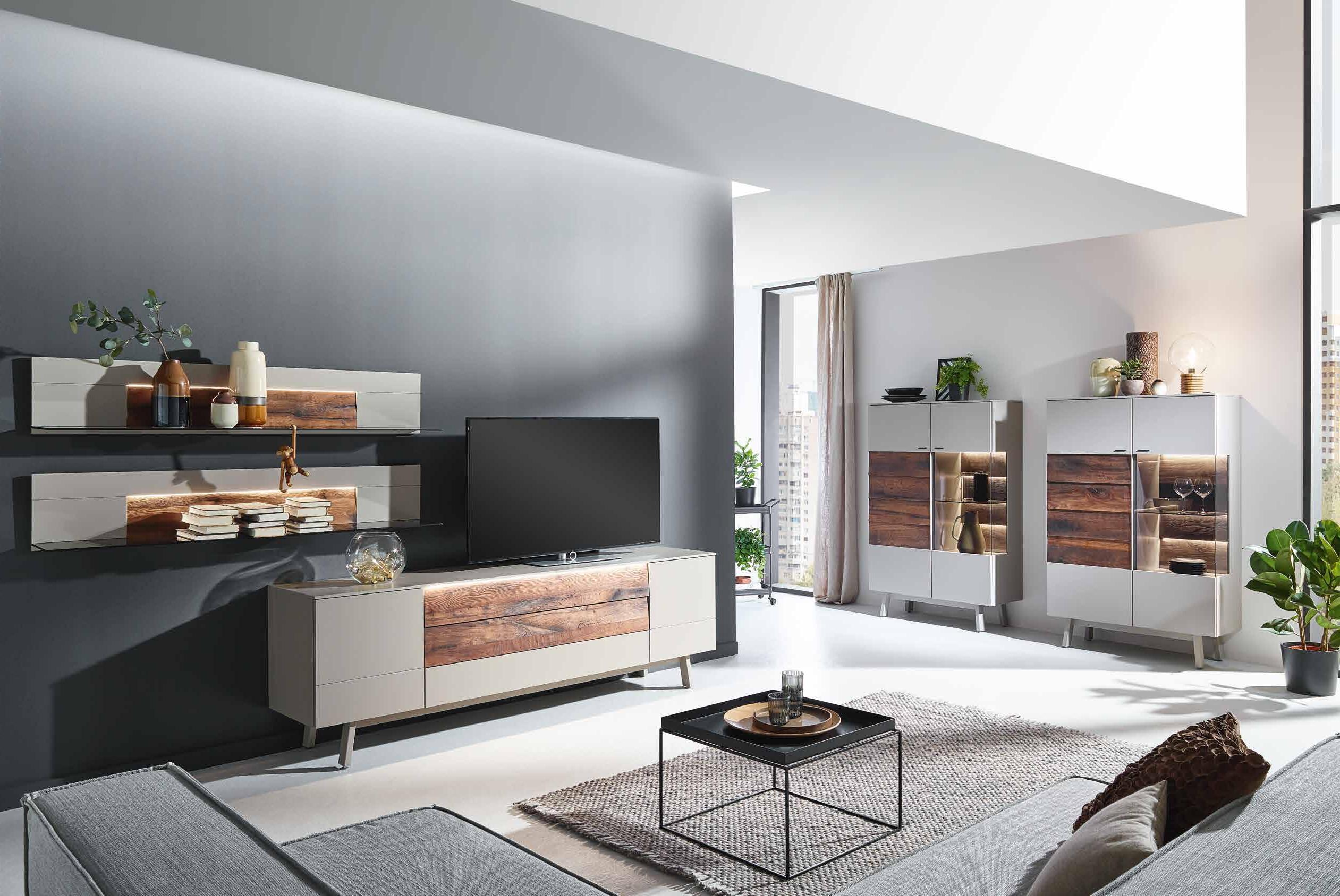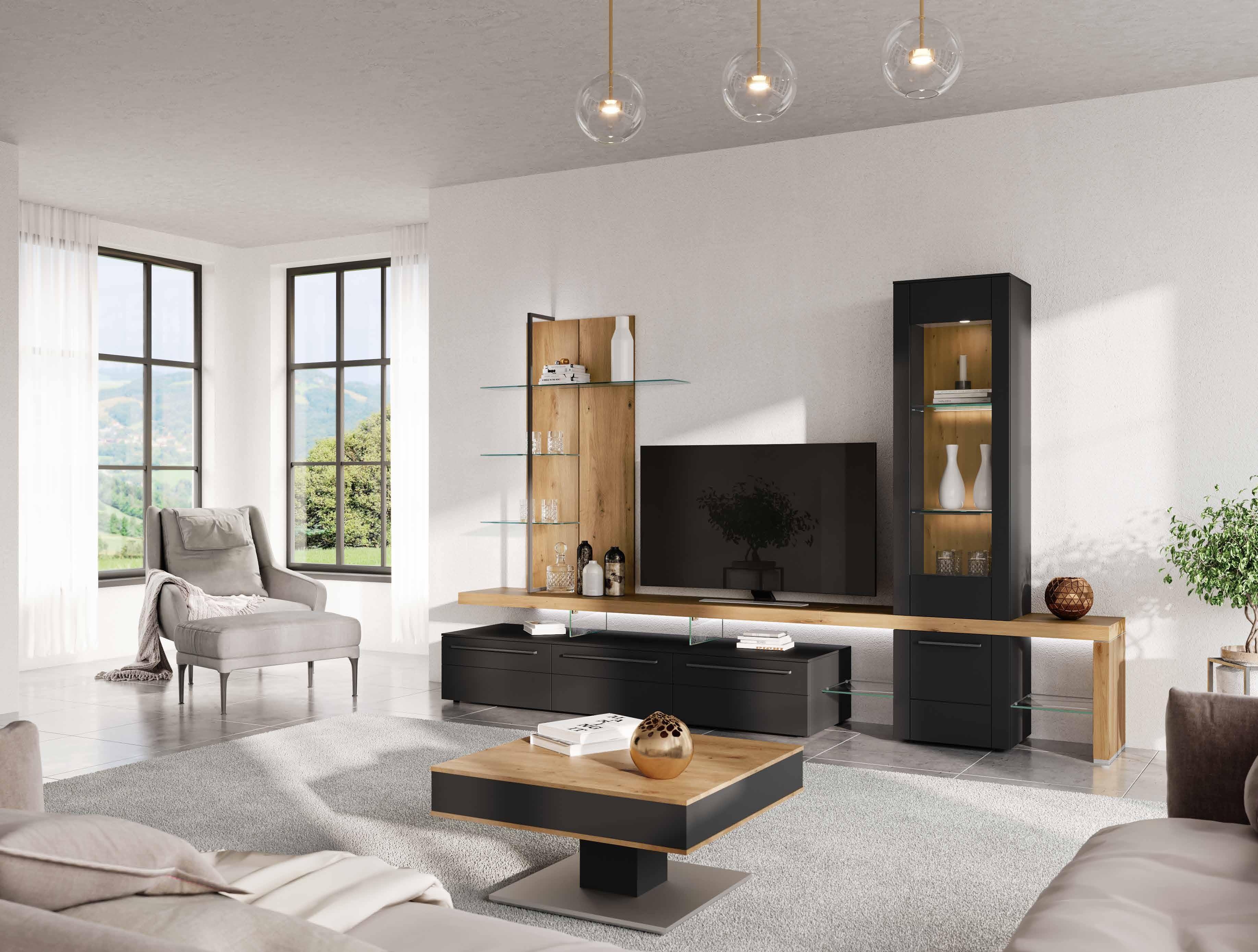 In einem modernisierten Look überzeugt BELLANO mit einem raffinierten Wandpaneel, welches die Wohnwand um eine Vitrinenlösung ergänzt. Harmonisch abgestimmt auf das Highboard mit Glasausschnitt, setzt sich der Glasboden im Wandpaneel fort und kreiert einen neuen Charakter im Wohnbild.