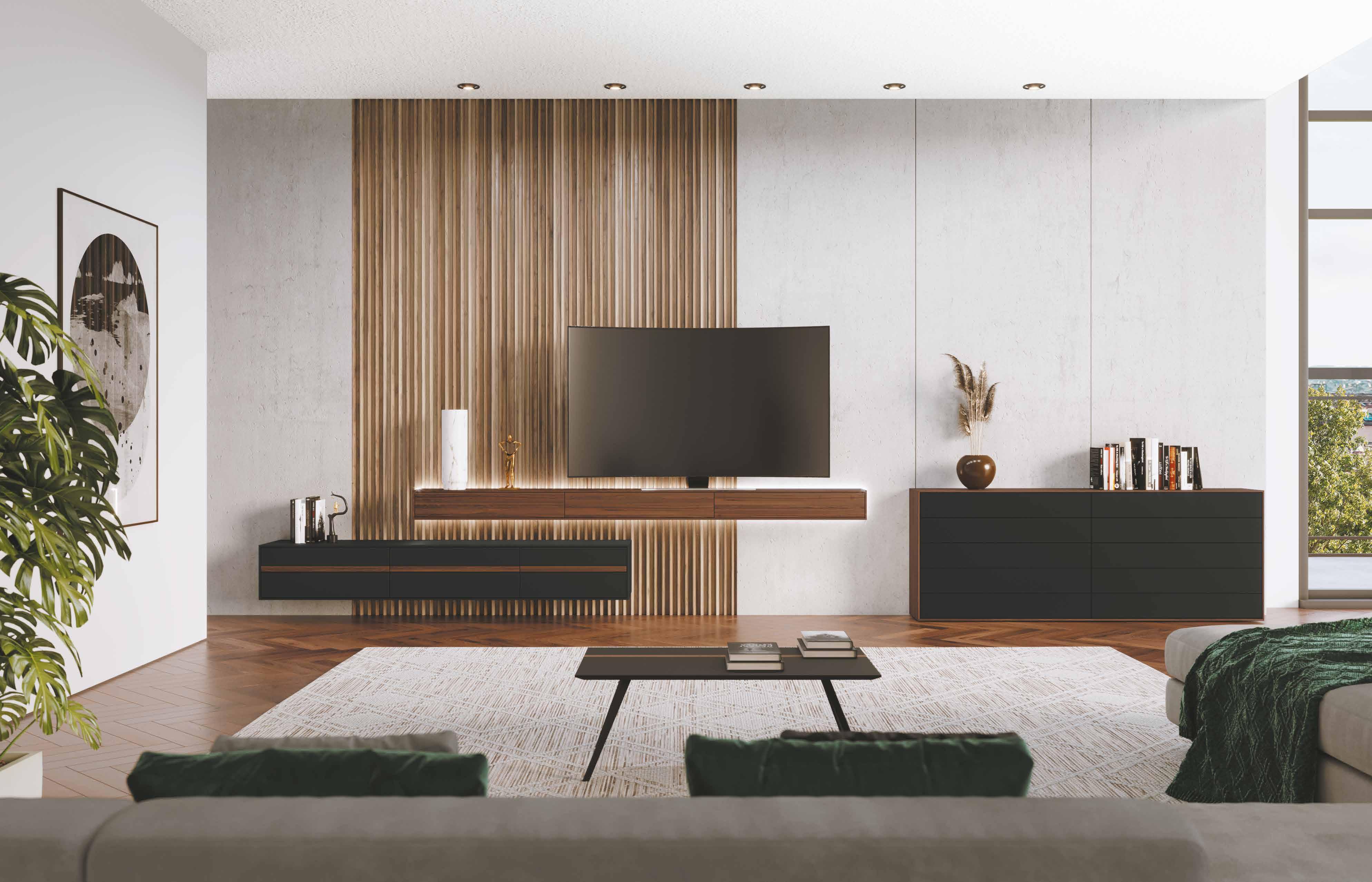 MISANO stands out for its natural elegance characterised by a careful combination of real wood, lacquer and glass. The combination of a floating wall unit with a continuous wall panel, tiered wooden sections and harmonious lighting sets the scene while make the striking wood structure come to life – all creating an impressive illusion of depth.