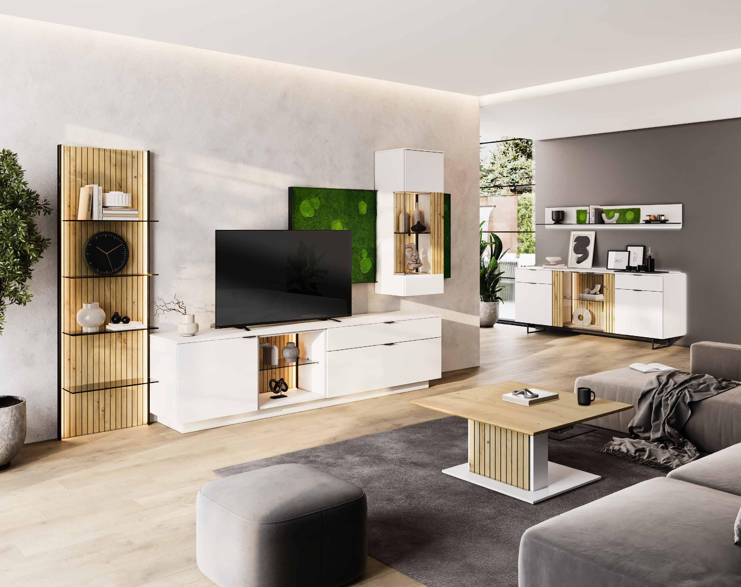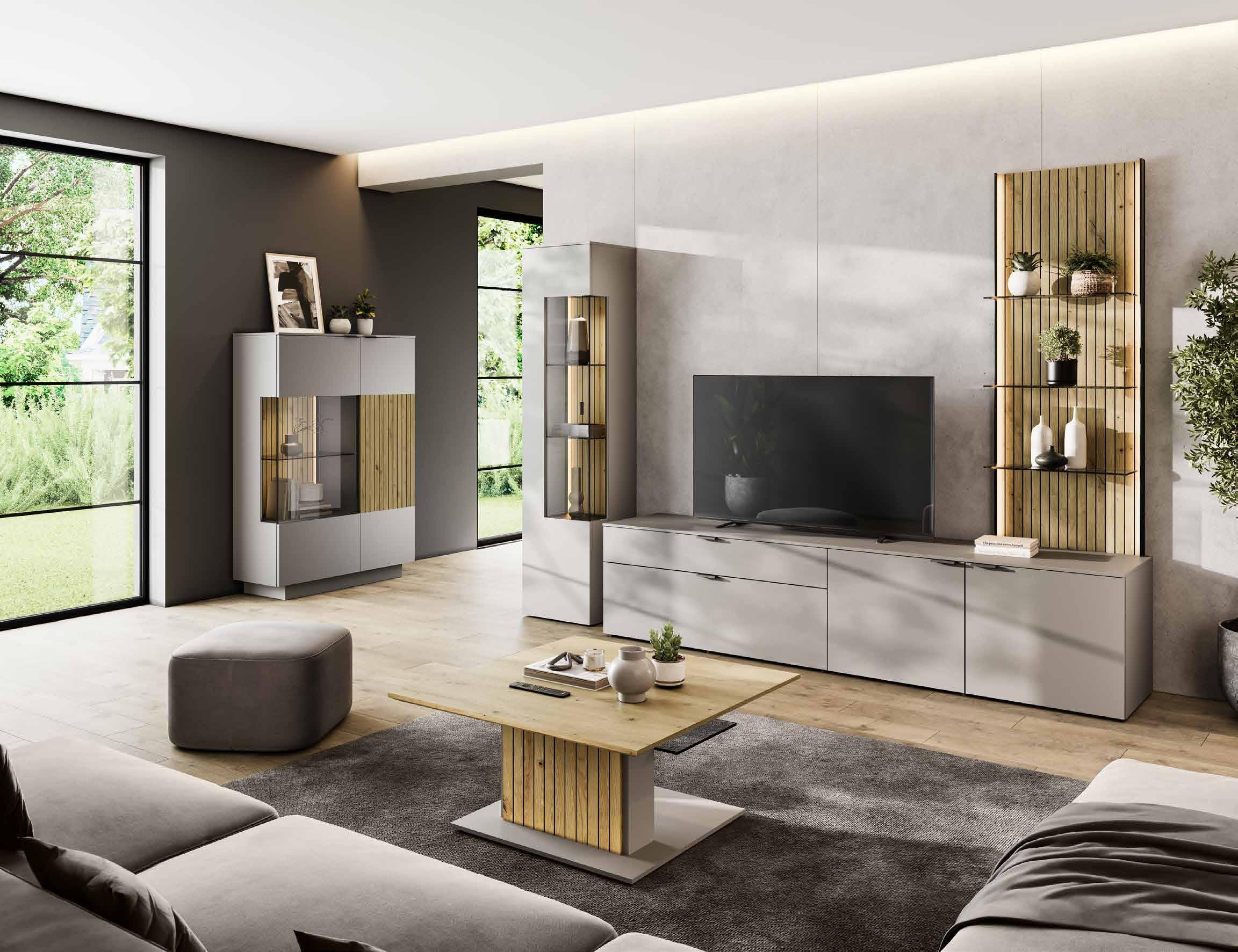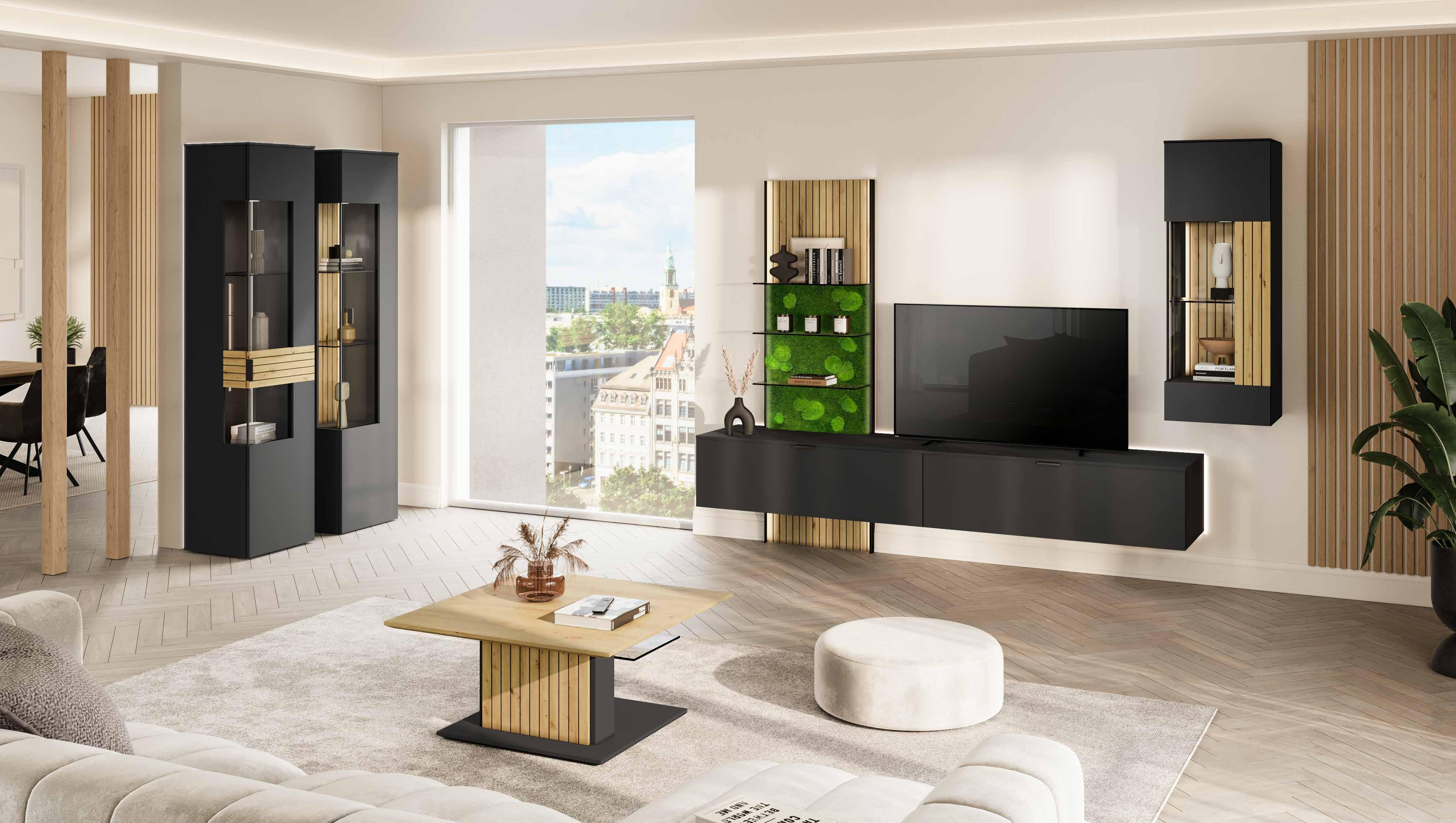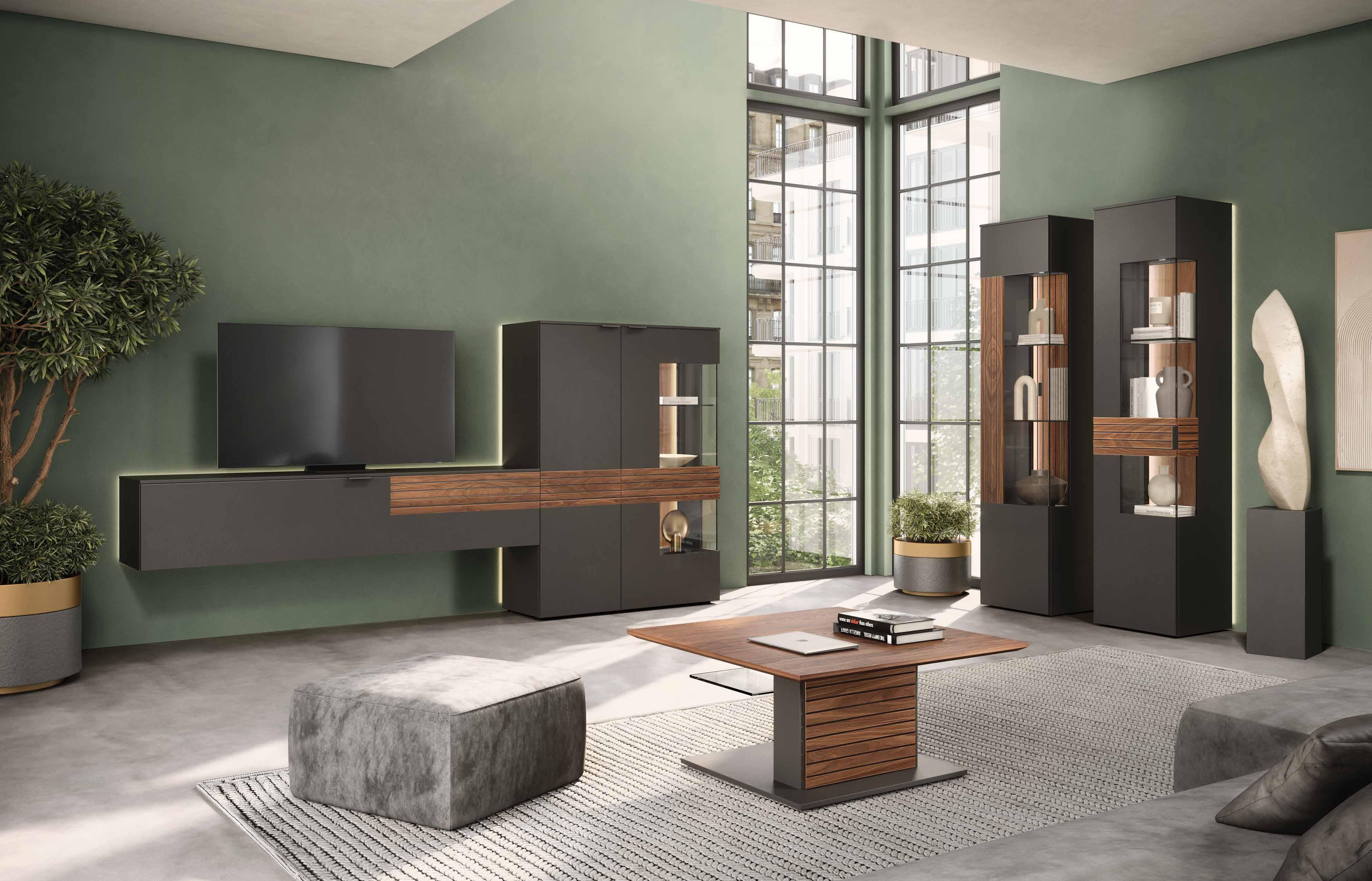 Clear edges are reflected in the model‘s design and are picked up again in the expressive slats. Ingeniously combined with grey parasol glass and anthracite metal, the result is a harmonious interplay of modernity and naturalness. This concept is further highlighted in the special wall panel with an integrated wall unit. You can decide whether you want to add metal runners to the LINERA base, or have it on a plinth, floor-standing or even wall-mounted – a particularly modern approach. The model is complemented by a matching coffee table.