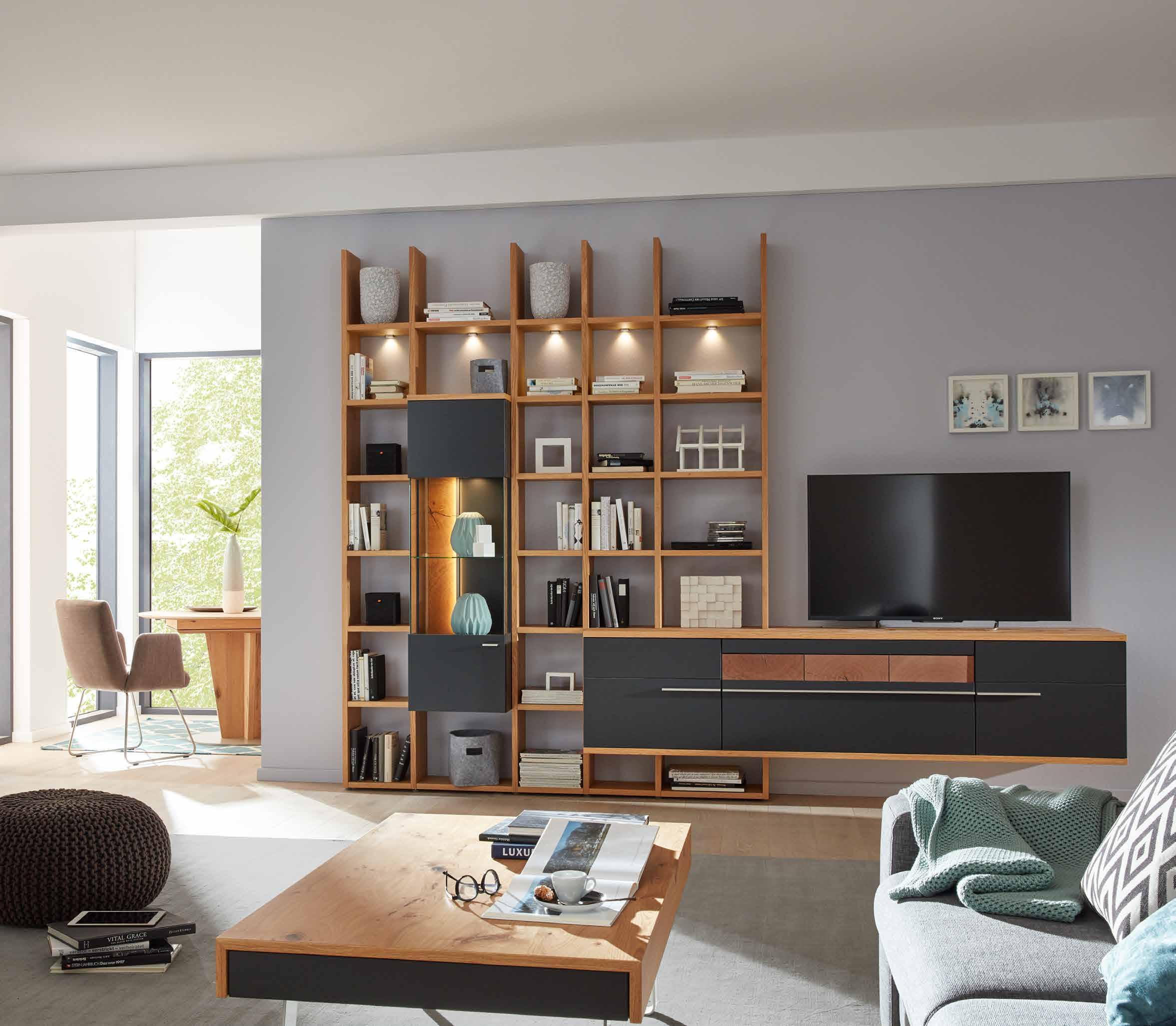 Klare Kanten spiegeln sich im Design des Modells wider und werden in der ausdrucksstarken Lamelle erneut aufgegriffen. Raffiniert kombiniert mit Parsolglas in Grau und Metall in Anthrazit entsteht ein harmonisches Zusammenspiel aus Modernität und Natürlichkeit. Dieses Konzept wird in dem besonderen Wandpaneel mit integriertem Hängeschrank weiter unterstrichen. Entscheiden Sie selbst, indem LINERA um Metallkufen im Untergestellt ergänzt wird, auf Sockel, bodenstehend oder bewusst modern, hängend überzeugt. Abgerundet wird das Modell durch den passenden Couchtisch.