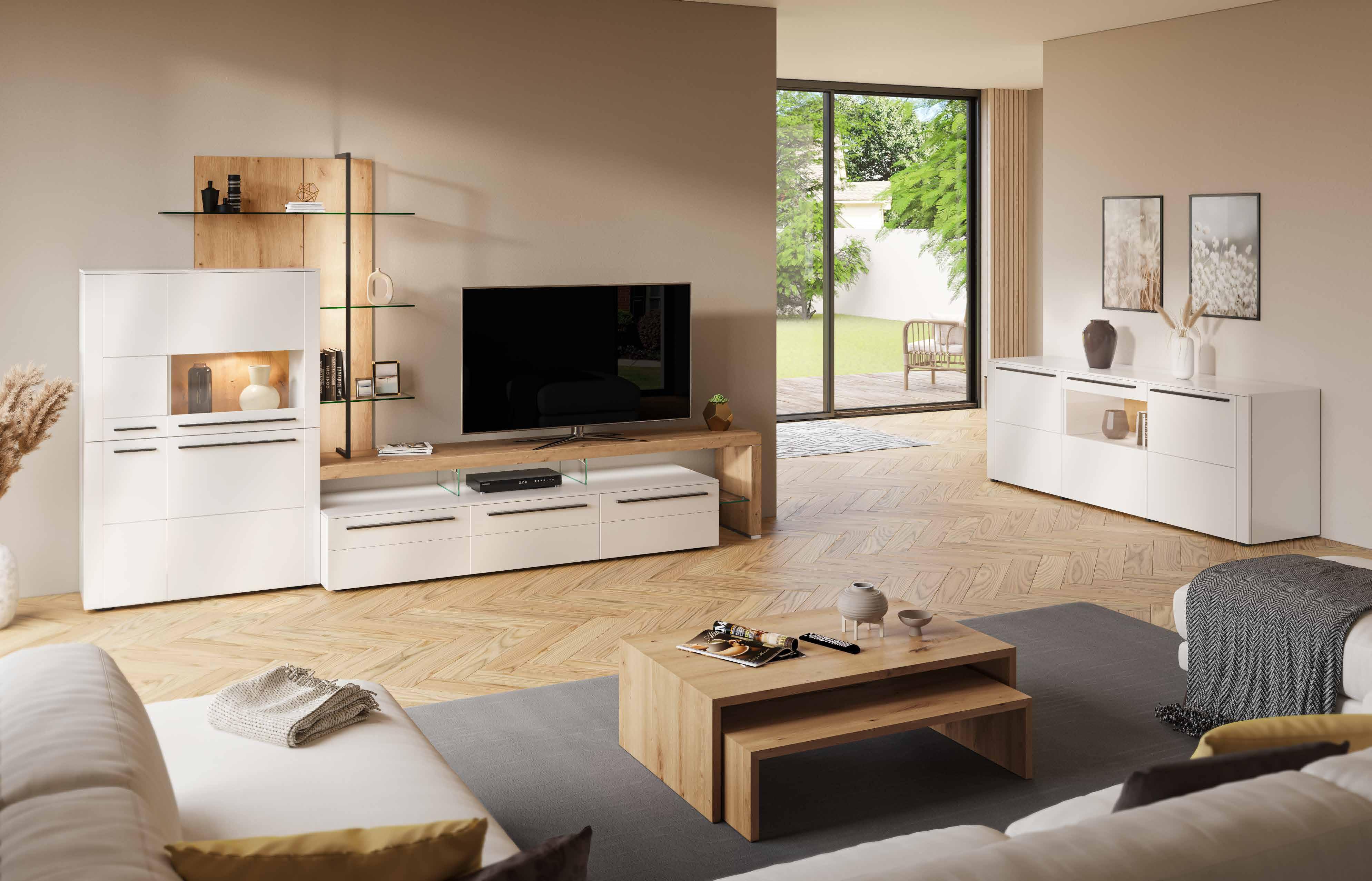 In a modernised look, BELLANO impresses with a refined wall panel that complements the living wall with a glass cabinet solution. Harmoniously coordinated with the highboard with glass cutout, the glass shelf continues in the wall panel and creates new character in the living room.