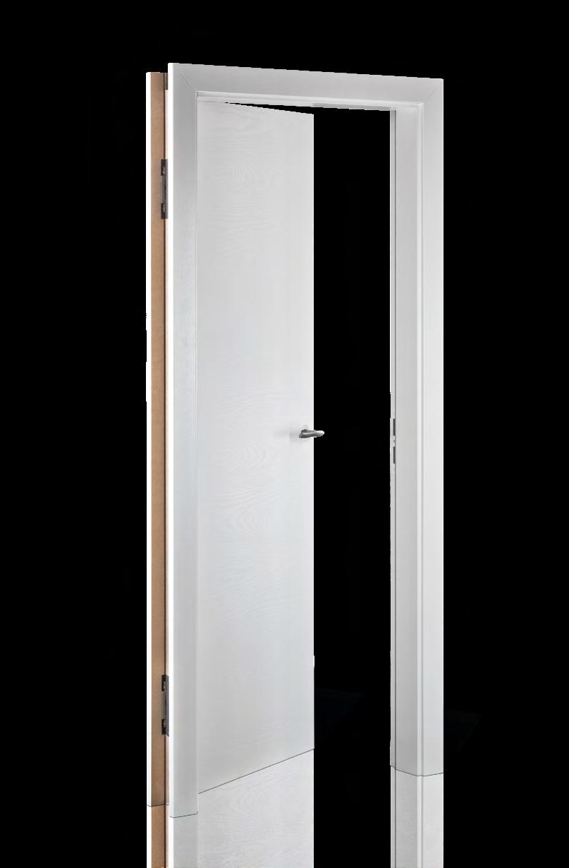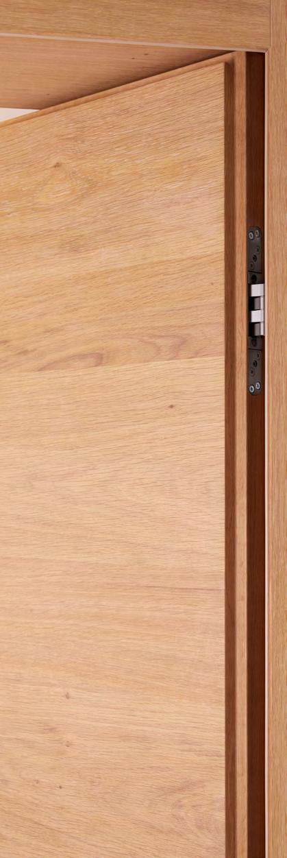 Eine leicht schwebende Anmutung erhält das Türblatt im System Infinity, denn es gibt keinen Türstock. Über eine Zarge ist das Türblatt mit der Wand verbunden, daher müssen hierfür bereits in der Planung die notwendigen Schritte bedacht werden. Der Rahmen wird vor den Verputz- oder Trockenbauarbeiten angebracht. Auf einer Raumseite ist das Türblatt stets bündig, auf der Gegenseite ist die Wandlaibung. Die wandbündige Seite kann frei gewählt sein, die Türen nach innen oder außen öffnend.