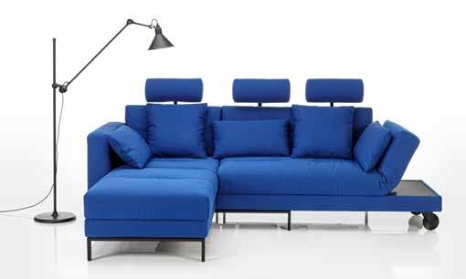 four-two soft ist eine kompakte Ecklösung mit Platz für vier, eine gemütliche Lounge-Landschaft oder ein bequemes Doppelbett von 150 x 210 cm. Das Drehsofa kann rechts oder links ausgerichtet sein. Unter der Armlehne des Sofas befindet sich eine Tischablagefläche. Die Armlehne am Longchair wird vorgezogen zur zusätzlichen Rückenlehne.