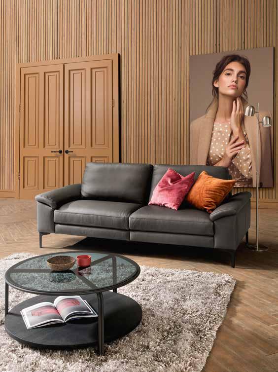 01 SOFA ANNA, 2,5- Sitzer, Leder W1, Füße: MF1 Metall schwarz, BHT ca. 188×86×98 cm, 1.839,–, ohne Deko 02 KOPFSTÜTZE, Leder WR65 grey, mit Rastomat verstellbar, BHT ca. 55×23×12 cm, je 179,– 03 ZIERKISSEN DELUXE , Stoff Ispra 156 hunter (100% Polyester), Füllung: Daunen und Silikon, BL ca. 50×50 cm, 49,– 04 ZIERKISSEN DELUXE , Stoff Ispra 132 gold (100% Polyester), Füllung: Daunen und Silikon, BL ca. 50×50 cm, 49,– 05 ZIERKISSEN DELUXE , Stoff Ispra 92 blush (100% Polyester), Füllung: Daunen und Silikon, BL ca. 50×50 cm, 49,– 07 COUCHTISCH HARRIET , Platte oben: getöntes Sicherheitsglas, Platte unten: Mango massiv, schwarz gebeizt, lackiert, Gestell: Metall anthrazit lackiert, ØH ca. 86×41 cm, 534,–, ohne Deko