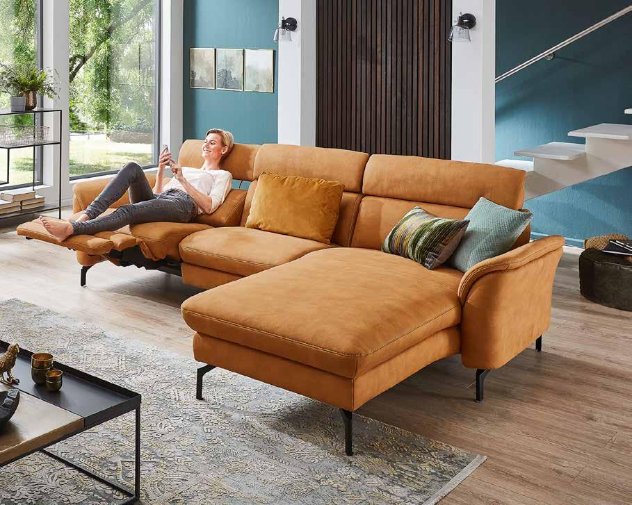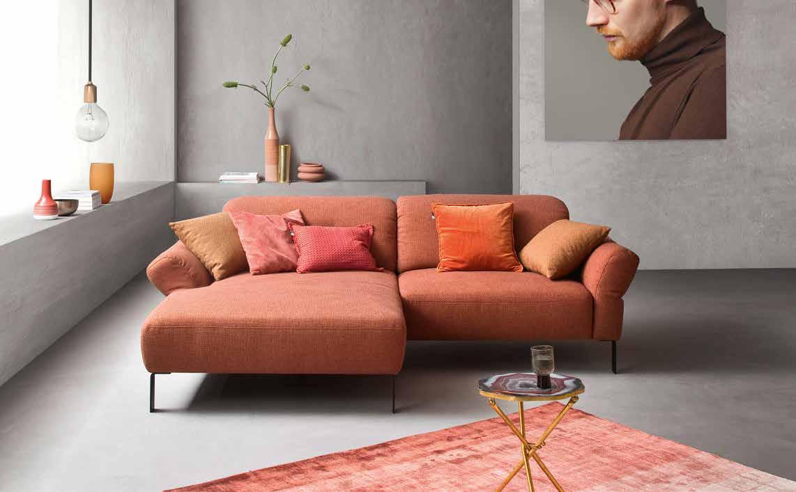 ECKKOMBINATION DAVID , Longchair groß mit Armteil links, 1,5-Sitzer groß mit Armteil rechts, Stoff Catona 146a Copper (100% Polyester), Füße: Metall MF1, inkl. klappbarer Armlehnen, verstellbarer Kopfstütze, Stellmaß ca. 176×262 cm, ohne Deko