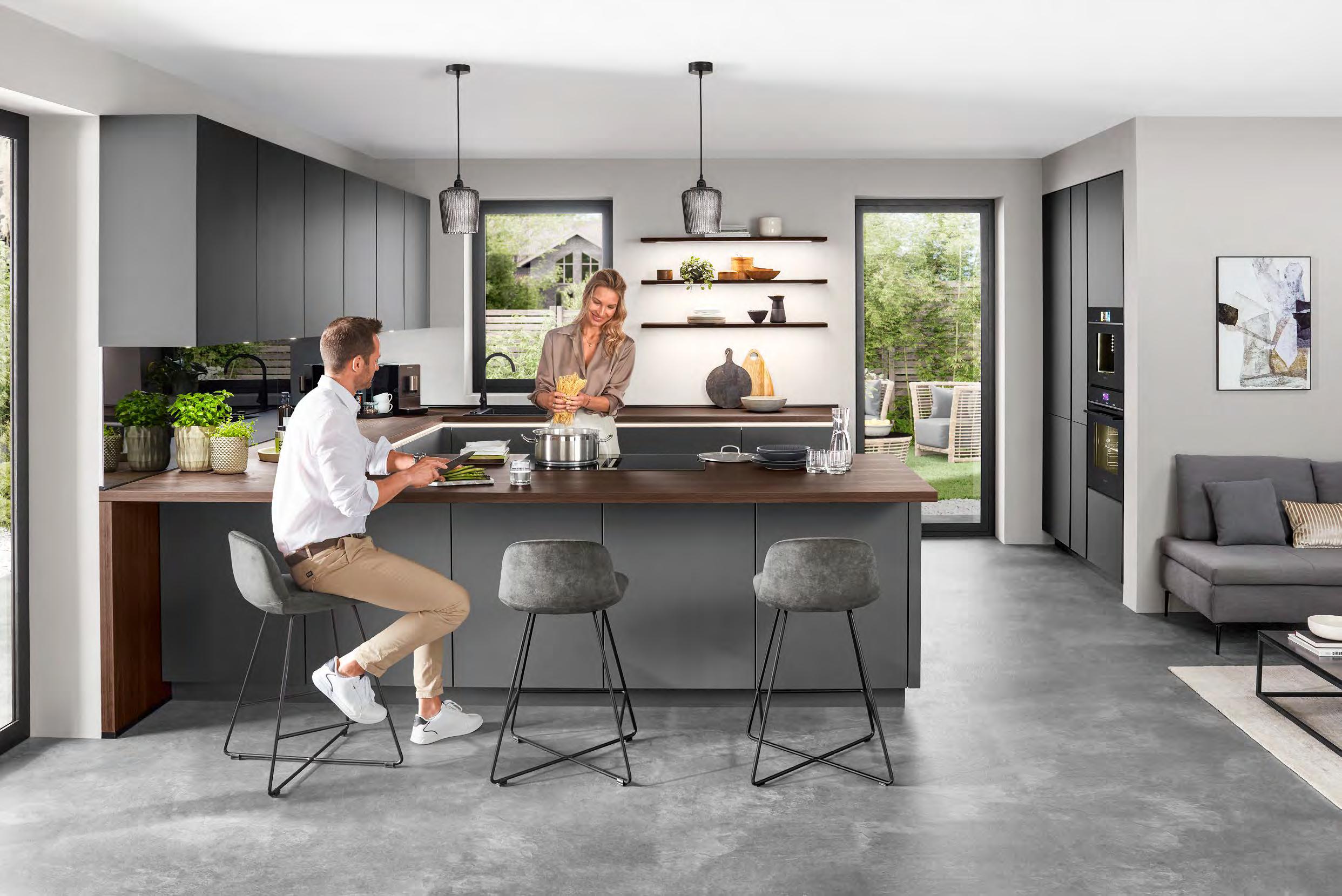 Hier verbringen wir Zeit miteinander, teilen Momente voller Genuss und genießen die Augenblicke, die den Küchenalltag besonders machen. Wir starten mit einem gemeinsamen Frühstück in den Tag, lachen und schmieden Pläne am Familientisch, plaudern beim Kochen, feiern Küchenpartys bis tief in die Nacht und scha en bleibende Erinnerungen. Denn eine Küche ist weit mehr als nur ein funktionaler Raum. Sie ist Tre punkt, Hobbyraum und Partyzone zugleich. So wird sie zum zentralen Lebensraum und damit der Mittelpunkt in unserem Zuhause. Lassen Sie sich inspirieren und gestalten Sie Ihre Küche ganz individuell. Entdecken Sie die vielen Möglichkeiten, die zu Ihren Bedürfnissen, Ihren täglichen Routinen und Ihrem persönlichen Stil passen.