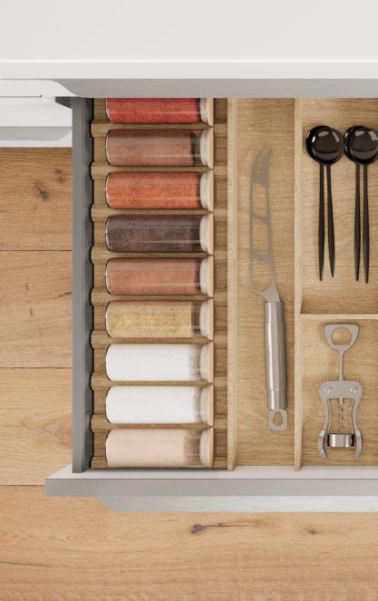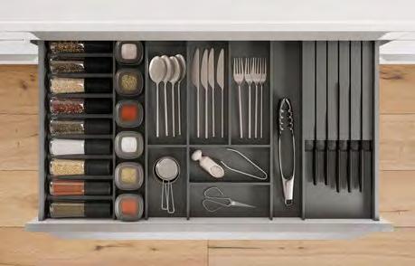 Our entire pull-out system and interior are characterised by a linear, minimalistic aesthetic in shape and colour. Whether as standard with a square railing, optionally with a glass side, glass panel or as a closed pull-out box: our multifaceted design options perfectly match your style and requirements. Add a personal touch with profiles and covers – subtle tone-on-tone or as a stylish contrast. It’s not just the appearance that impresses, but also the convenient features. Even with its high total load capacity of up to 70 kg, the nBOX o ers smooth operation.