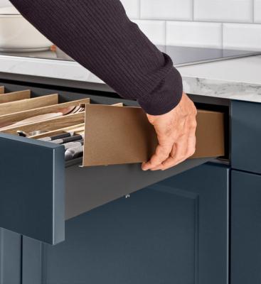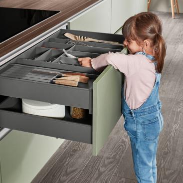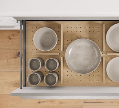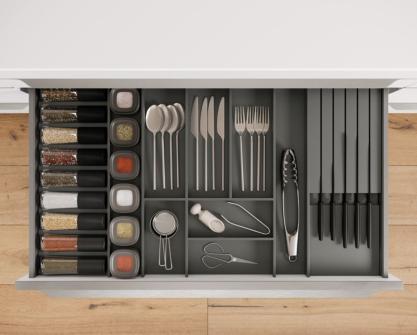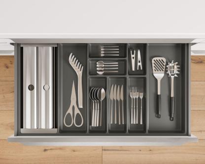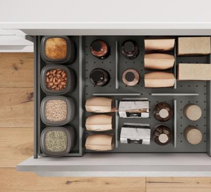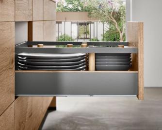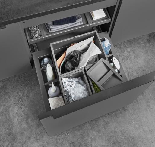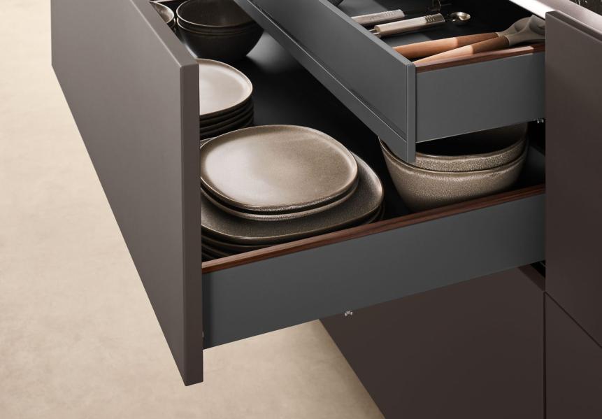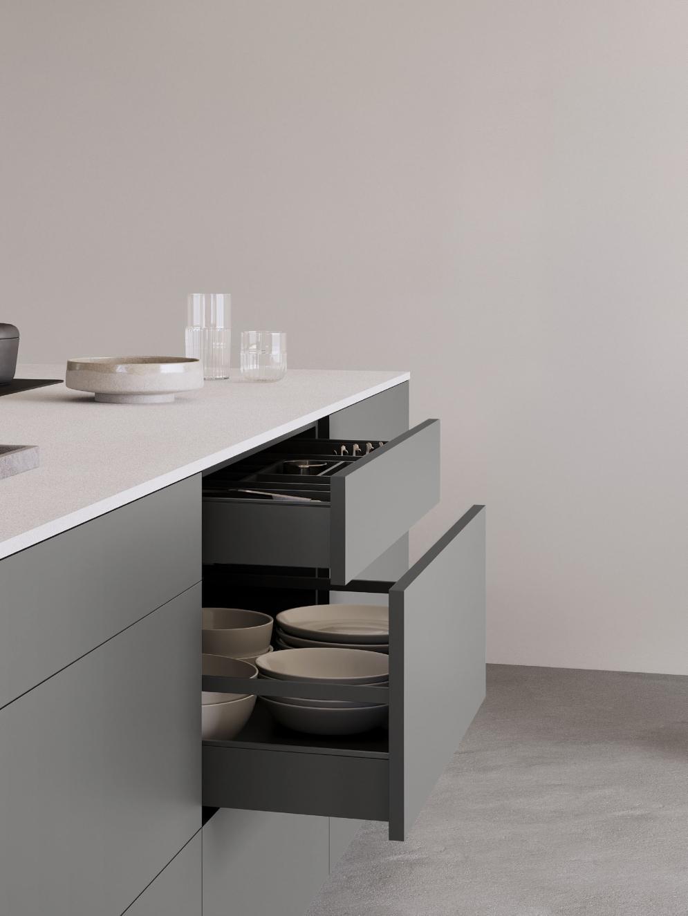 The nBOX impresses with its delicate lines, a striking, cubic design idiom and the narrow drawer frame of just 10.7 mm that gives the innovative drawer its puristic character. The sophisticated slate grey colour, which is also available for the interior, highlights the drawer’s timeless elegance. Ideal for a cohesive kitchen, bathroom and living room design.