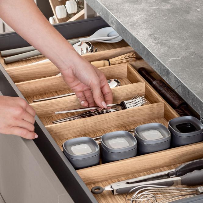 Die nBOX besticht durch ihre filigranen Linien, eine markante, kubische Formensprache und die schlanke Schubkastenzarge von nur 10,7 mm, die dem innovativen Schubkasten seinen puristischen Charakter verleiht. Das edle Schiefergrau, das optional auch im Innenkorpus zur Geltung kommt, unterstreicht die zeitlose Eleganz. Ideal für eine durchgängige Gestaltung von Küche, Bad und Wohnraum.