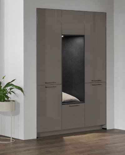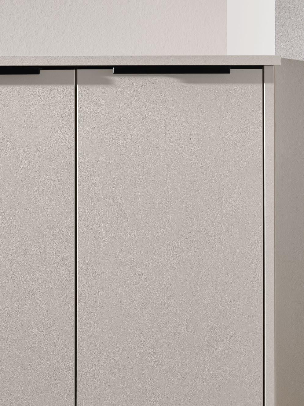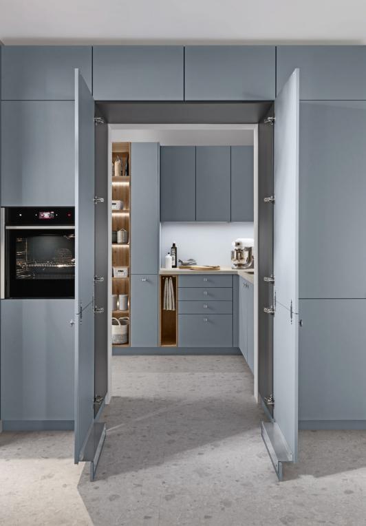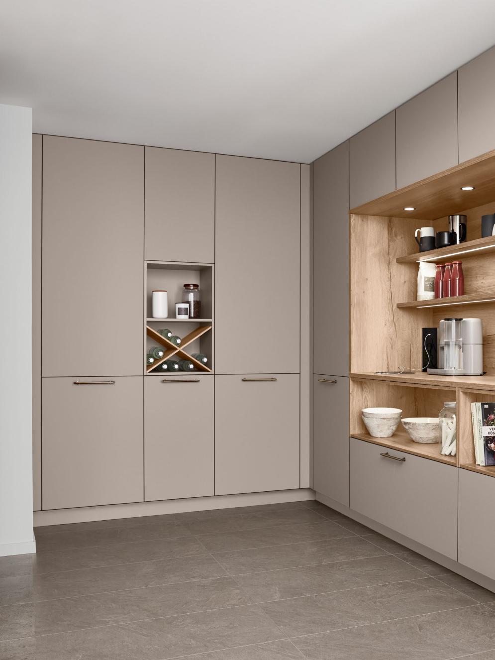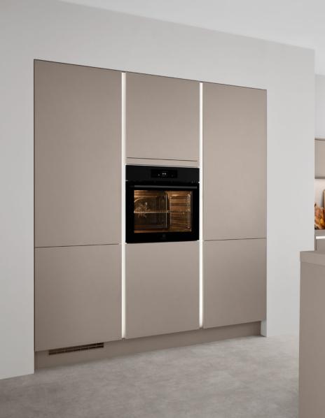 Vertical recessed handles accentuate the lines in floor-to-ceiling designs up to three metres tall and can be equipped with integrated lighting for a soft, atmospheric glow.