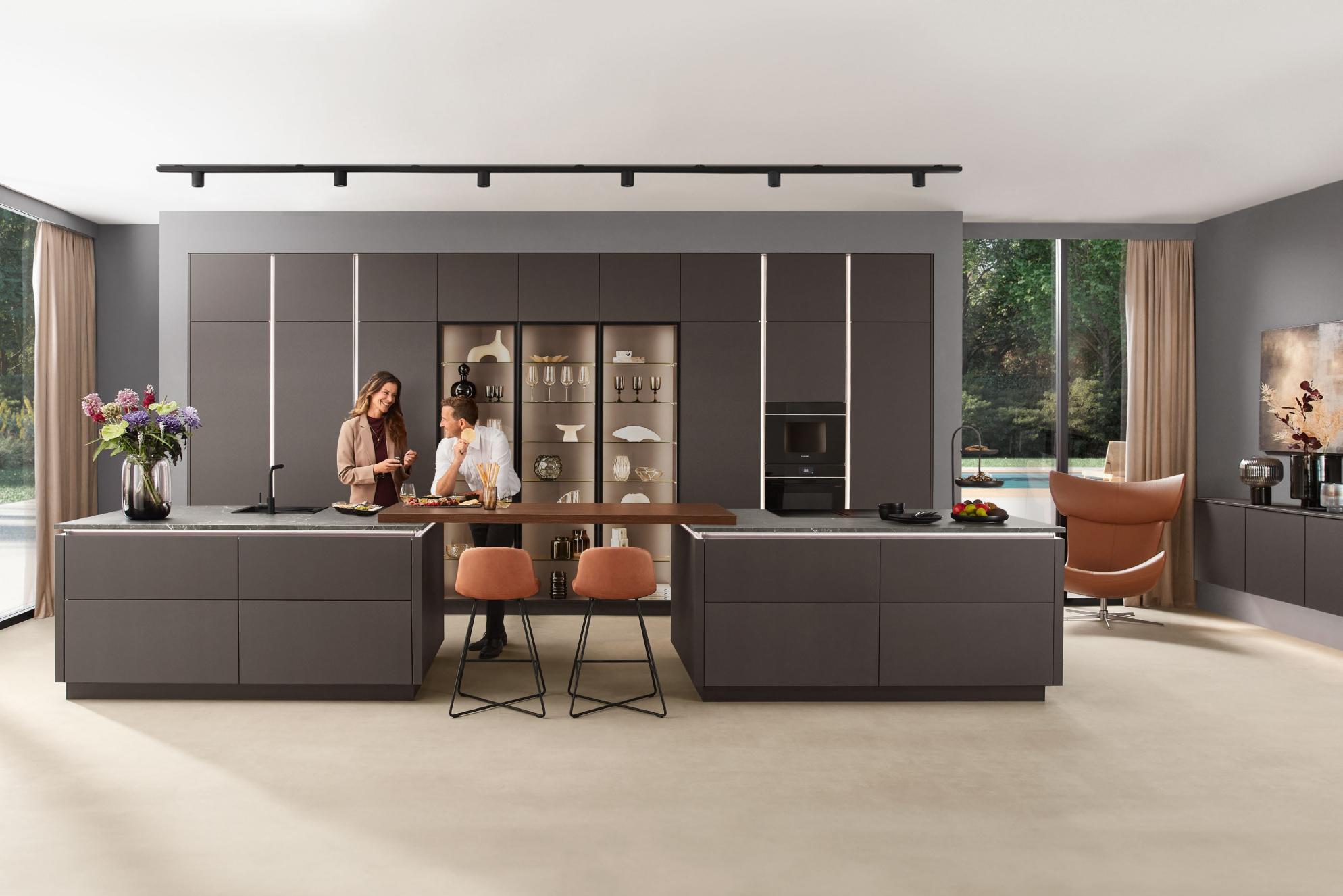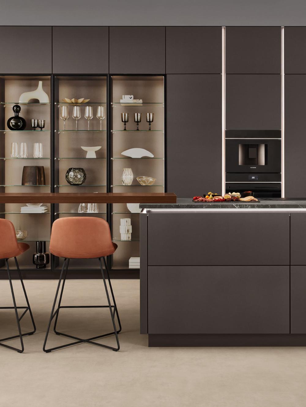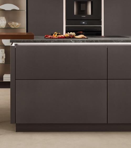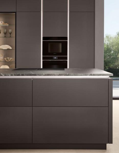 Diese Küche scha t einen geschmackvollen Rahmen, der zum entspannten Ausklang des Tages einlädt. Dunkel und edel in der Farbe Co ee gehalten, dabei wohltuend warm. Das großzügige Ambiente setzt auf klare, geradlinige Ästhetik und viel Freiraum zum Kochen. Zwei Kücheninseln bilden, zusammen mit der Thekenplatte als verbindendes Element, das Herzstück – o en, einladend, gescha en für Gespräche und gemeinsame Momente.