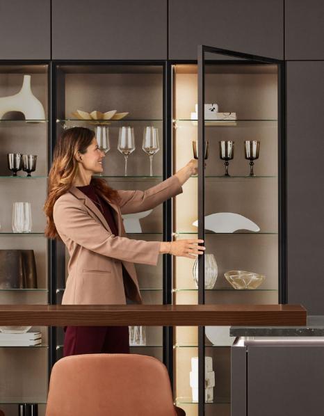 Die Vitrinen Air mit filigranem Alurahmen kommen ohne sichtbare Scharniere aus und unterstreichen den puristischen Look der Küchengestaltung. Ein Statement und Blickfang für alle, die außergewöhnliches Design schätzen.