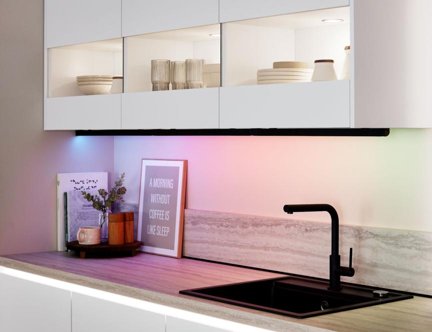 Illuminated double-track recessed handles create a cosy atmosphere.