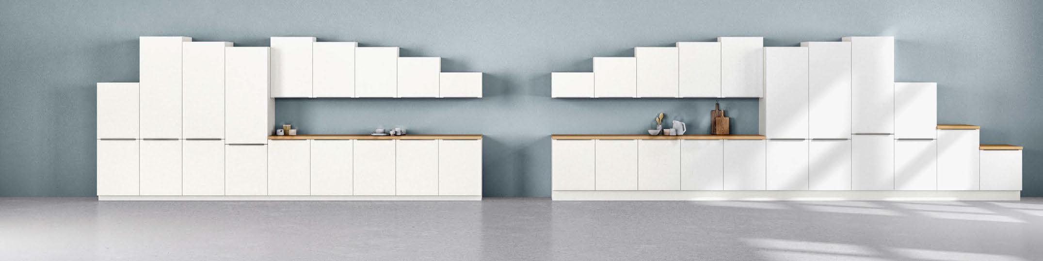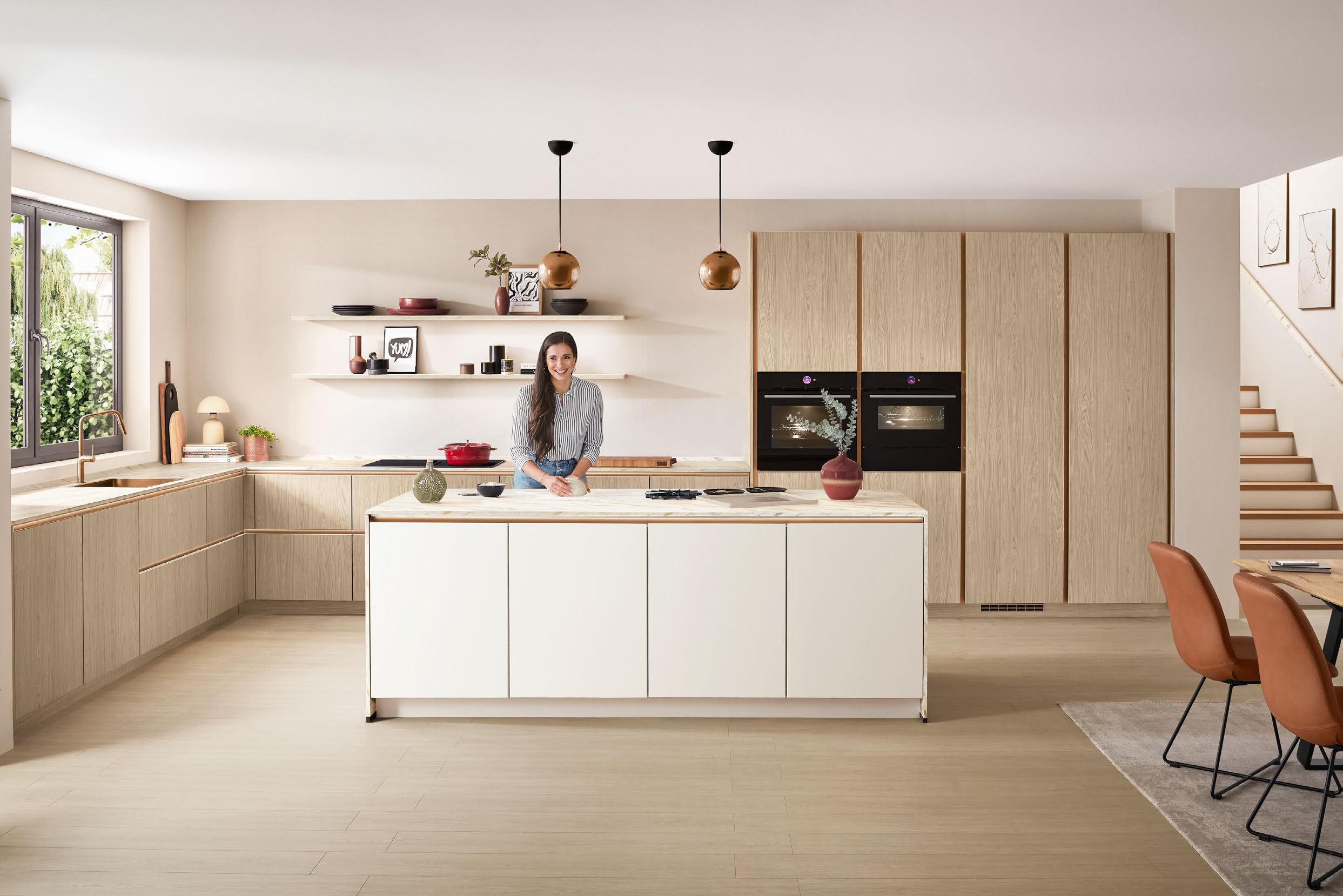 Whether lacquered fronts in stylish colours or wood looks with distinctive grain, an effective mix of materials will provide your kitchen with a whole new radiance. Olive and Milano walnut ensure a natural ambience of well-being, whilst Como oak and sky pastel create a relaxed, bright atmosphere. Handleless tall unit fronts throughout enhance the clear and calming appearance and boast a push-to-open function for convenient opening.