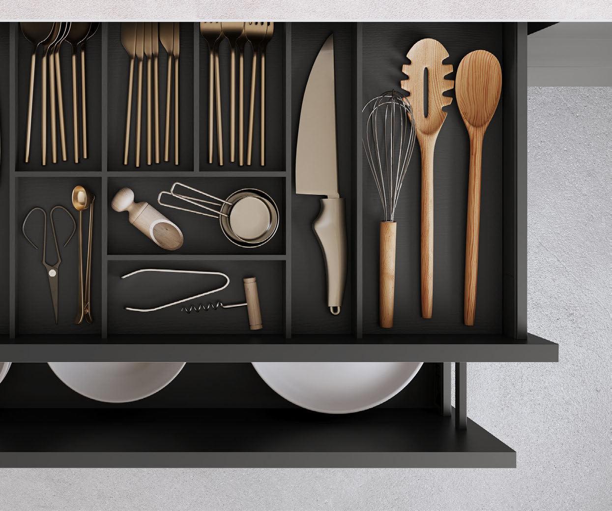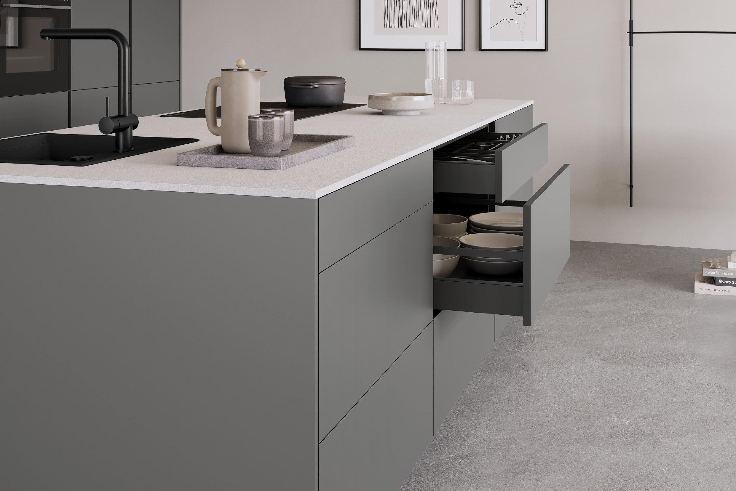 Our new, innovative nBOX drawer and pull-out system is setting new benchmarks in functionality and individual design diversity. Drawers, pull-outs and the full interior are radiant in elegant slate grey –and perfectly complement the kitchen design.