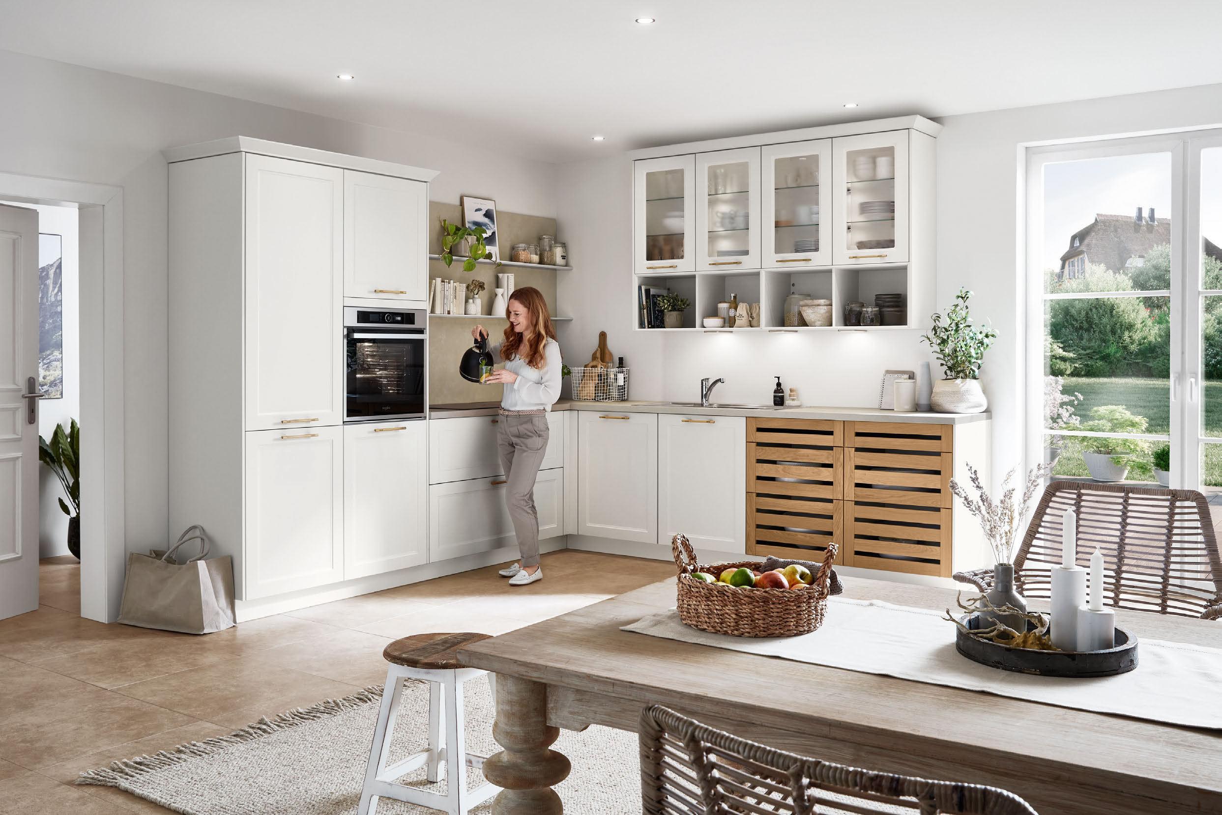 Ob Lackfronten in angesagten Farben oder Holzoptiken mit charaktervoller Maserung: Ein gekonnter Materialmix verleiht Ihrer Küche eine ganz besondere Ausstrahlung. Olive und Nussbaum Milano sorgen für ein natürliches Wohlfühlambiente, Eiche Como und der Pastellton Sky schaffen eine gelassene, helle Atmosphäre. Die durchgehenden, grifflosen Hochschrankfronten unterstützen das klare, ruhige Gesamtbild und lassen sich bequem per Push-to-open-Funktion öffnen.
