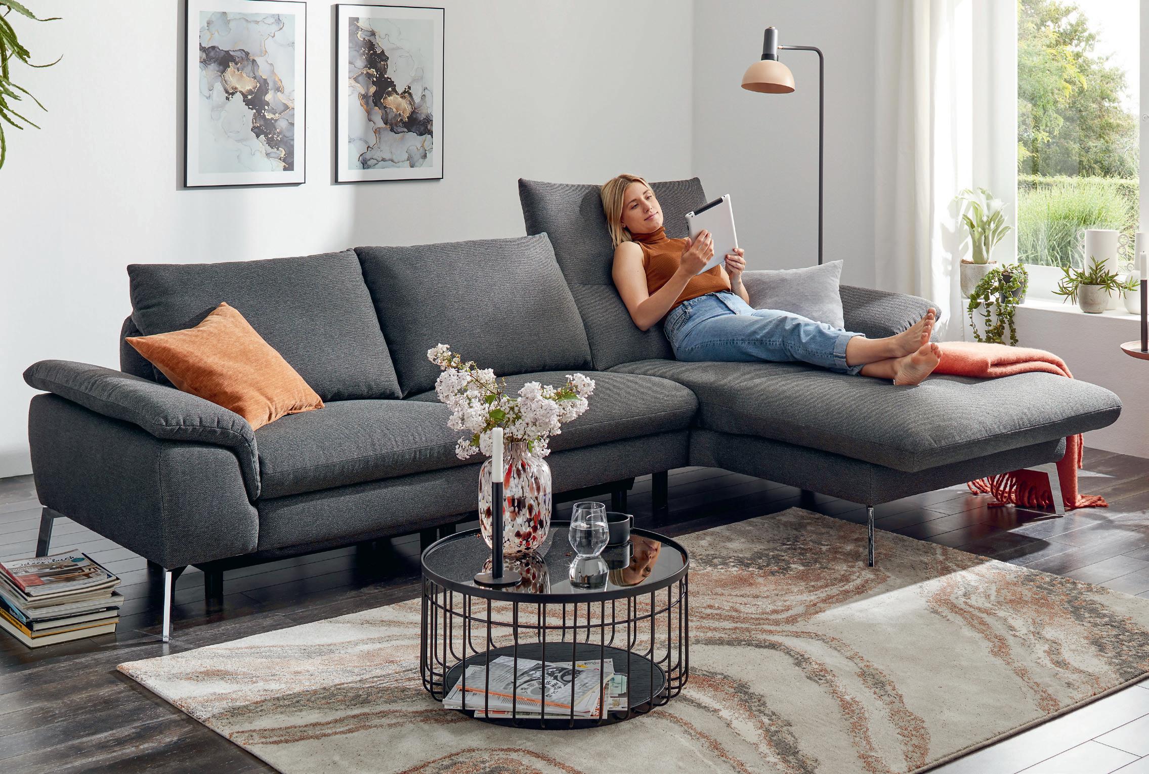 Luftig elegante Polsterecke GLOBAL GOTERA mit Sitzpolsterung Tonnentaschenfederkern, in Stoff Twice dark grey, bestehend aus: 2,5 Sitzer mit Armlehne und Longchair mit Armlehne, BHT ca. 297 cm x 86(111) cm x 161 cm, 2.095,-.