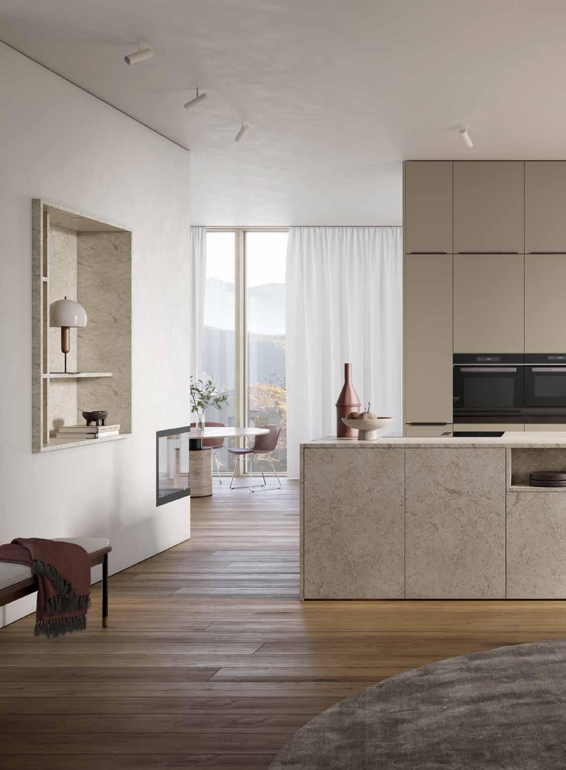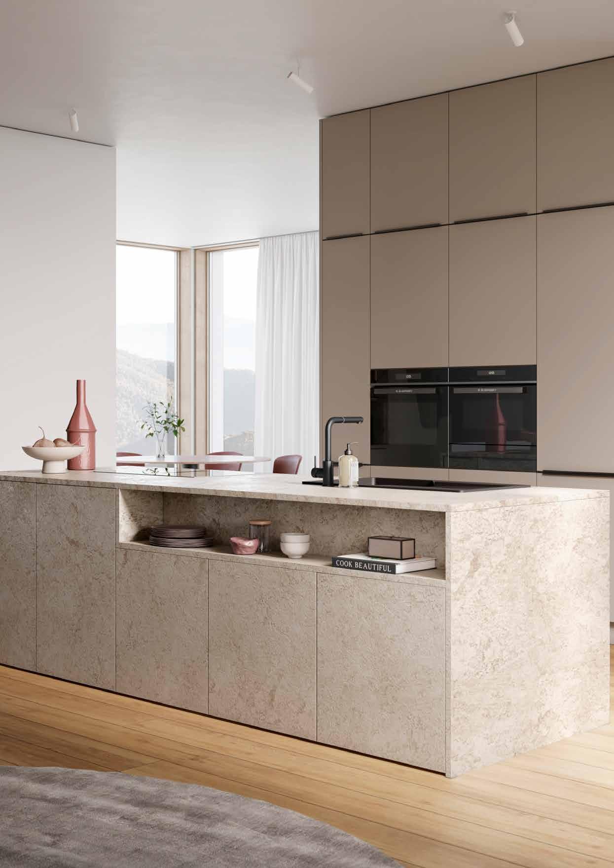 De zachte kleuren en het elegante frontontwerp met brede omlijsting zijn indrukwekkend. Verzonken grepen en handgrepen in goudkleur ronden de look charmant af. De omlijsting plaatst accenten en zorgt samen met de hoogwaardige materialen en het zorgvuldige vakmanschap voor een harmonieus totaalbeeld. Functionaliteit en stijl worden perfect gecombineerd. Een keuken die indruk maakt met zijn eenvoudige elegantie.