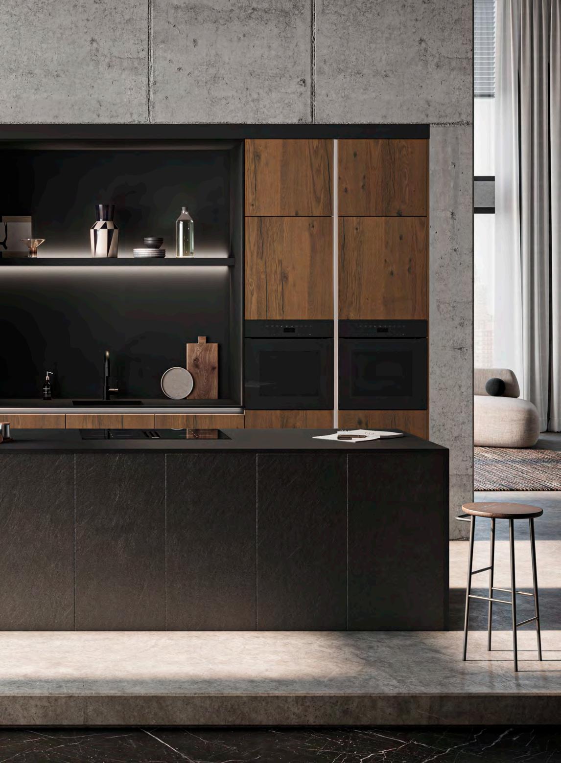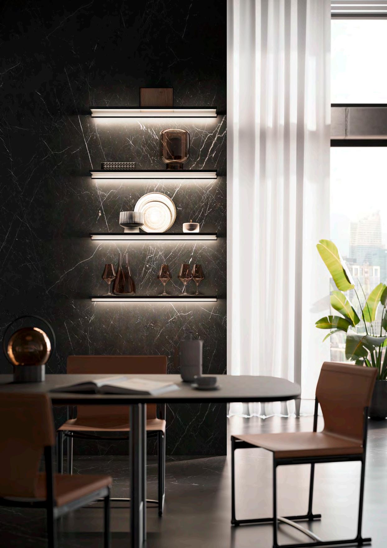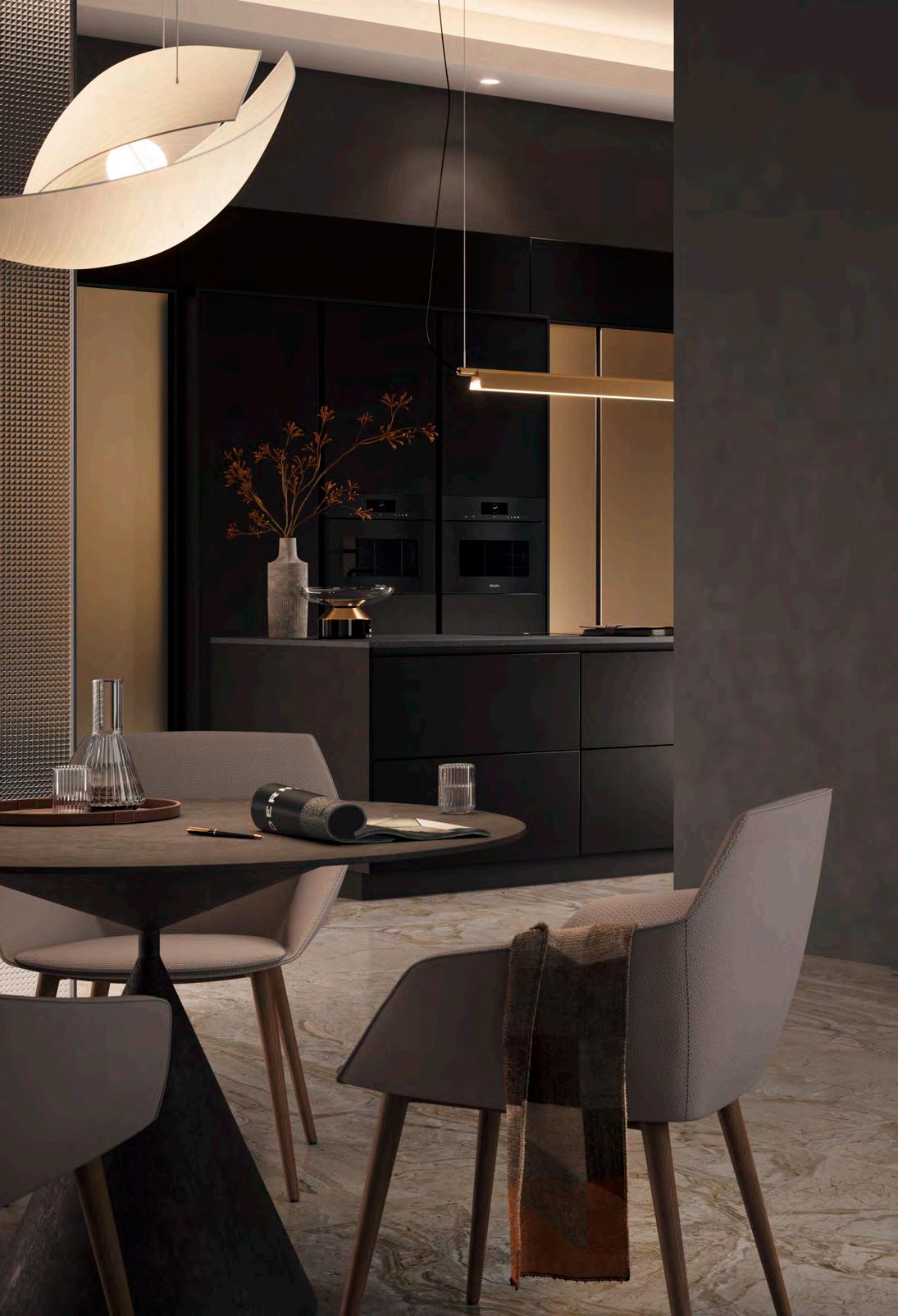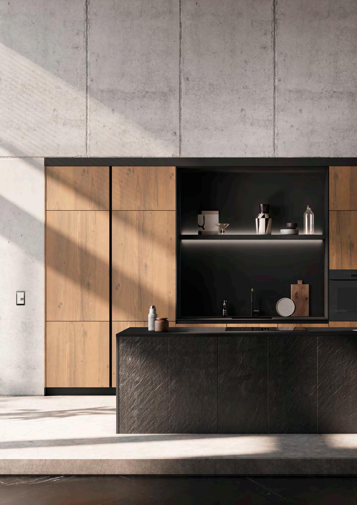 Climber-technologie zorgt voor een revolutie in het keukenontwerp met sensorgestuurde glaselementen die openen en sluiten. Het ontwerp blijft onberispelijk zonder handgrepen of knoppen. Getint zwart glas, omlijst door smalle metalen frames, integreert naadloos in moderne keukenfronten. Led-lampen met kleurtemperatuurregeling plaatsen accenten en presenteren schatten in perfect licht – innovatie ontmoet pure esthetiek.