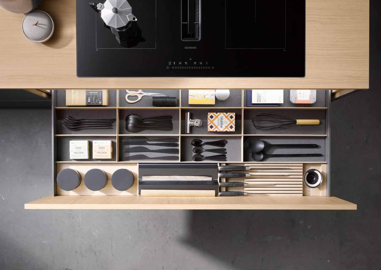 Mit eleganten Schubkasteneinsätzen und raffinierten Auszugseinteilungen werden Auszüge zum Meisterwerk der Organisation. Wir bieten verschiedene Möglichkeiten, um Schubkästen und Auszüge individuell und stilvoll zu ordnen. Ob in Kunststoff oder Echtholz – hochwertige Materialien und durchdachtes Design sorgen dafür, dass alles seinen Platz findet – vom kleinsten Löffel bis zum größten Kochutensil. Darüber hinaus verfügen die Auszüge über eine integrierte Auszugsbeleuchtung.
