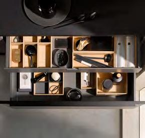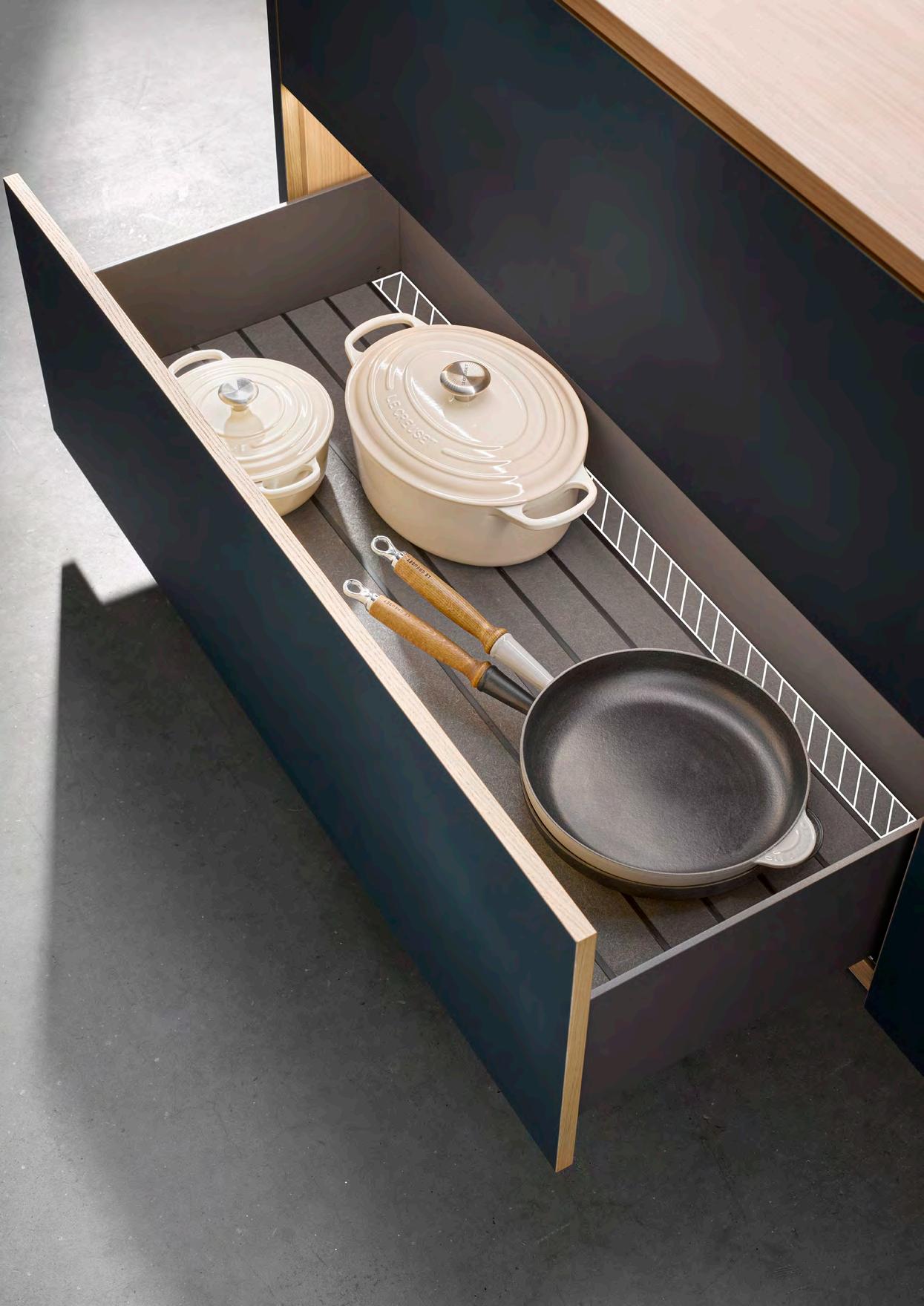 Dzięki eleganckim wkładom do szuflad i wyrafinowanym podziałom szuflad głębokich, przestrzenie te stają się arcydziełem organizacji. Oferujemy różne opcje indywidualnej eleganckiej organizacji każdego rodzaju szuflad. Niezależnie od tego, czy są wykonane z tworzywa sztucznego, czy z prawdziwego drewna - wysokiej jakości materiały i przemyślana konstrukcja zapewniają, że wszystko ma tam swoje miejsce – od najmniejszej łyżeczki po największe przybory kuchenne. Szuflady głębokie mają również zintegrowane oświetlenie.