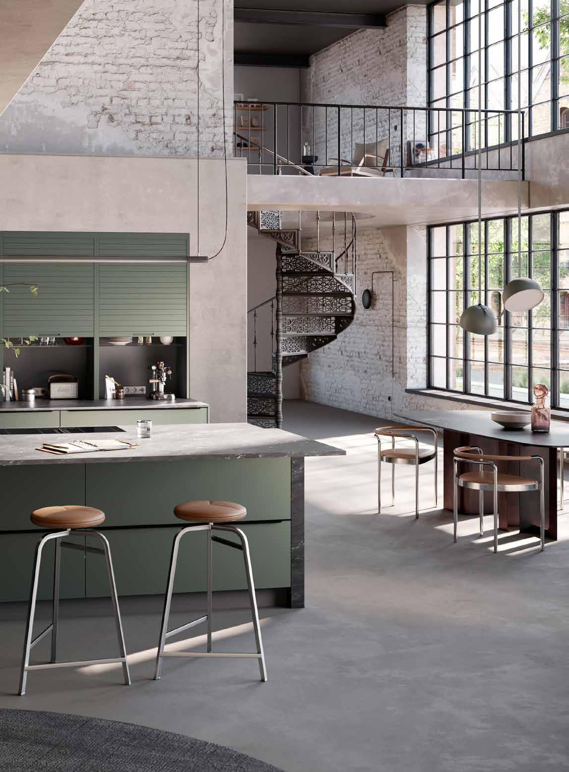 Ten niestandardowy projekt kuchni w niepowtarzalnym odcieniu zieleni zachwyca frontami o lekko zaokrąglonej fazowanej krawędzi. Delikatna zieleń emanuje spokojną elegancją, a witryna Climber podkreśla charakter tej niezwykłej kuchni. Blat roboczy w kolorze carrara-weiß bieli potęguje atrakcyjność wizualną. Dzięki innowacyjnej funkcjonalności i niepowtarzalnemu designowi, ta kuchnia jest źródłem inspiracji.