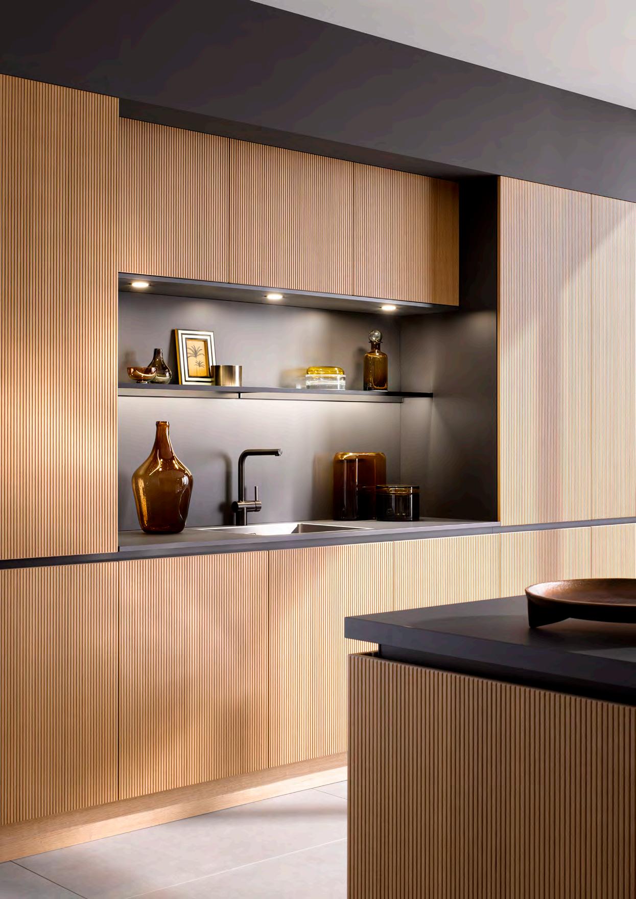 Für einen großen Auftritt: Diese Küchengestaltung beeindruckt mit einer vertikalen Rillenfront aus feinstem Echtholzfurnier. Die natürliche Maserung des Holzes wird durch die feinen Rillen optisch hervorgehoben, was der Küche eine einzigartige Struktur und Tiefe verleiht. Die harmonische Kombination aus natürlichem Holz und Elementen in Graphit schafft ein einladendes Ambiente.