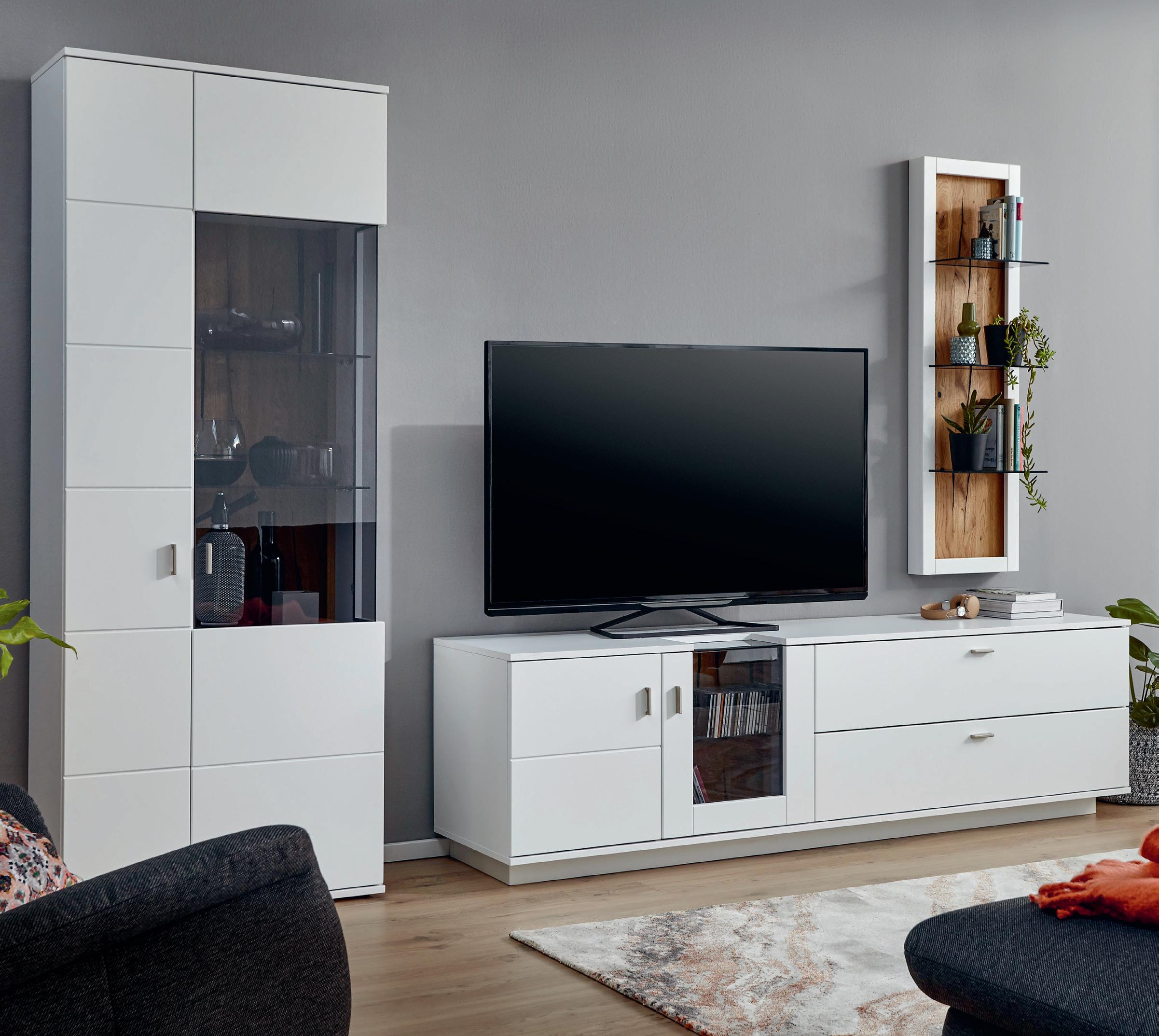 GLOBAL RUBIA Front außen: Lack weiß, Korpus innen: Melamin weiß, Frontund Seitenverglasung: Parsol grau, sichtbare Rückwand: Riss-Eiche furniert, Metallgri e: Nickel matt, Schubkästen und Türen gedämpft, bestehend aus: Vitrine mit 1 Holztür, 1 Holz-/Glastür, Lowboard mit 1 Holztür, 1 Tür mit Glaseinsatz, 2 Schubkästen, 1 Wandpaneel mit 3 Glasböden, Stellmaß BHT ca. 305x207x50 cm, 2198.-*,