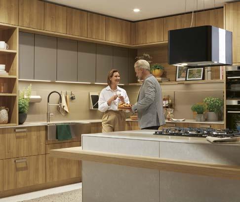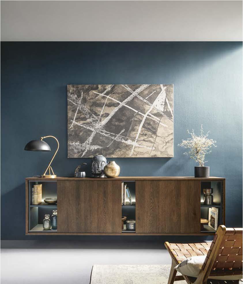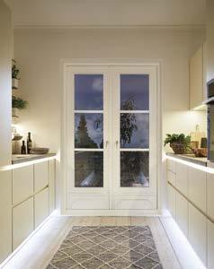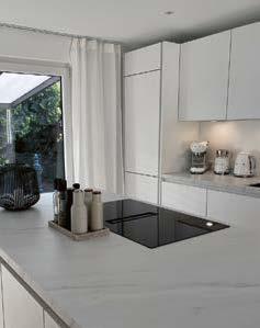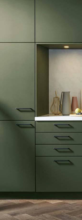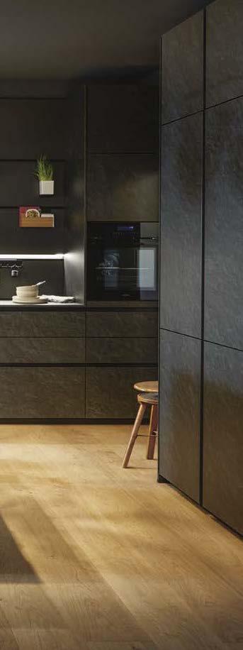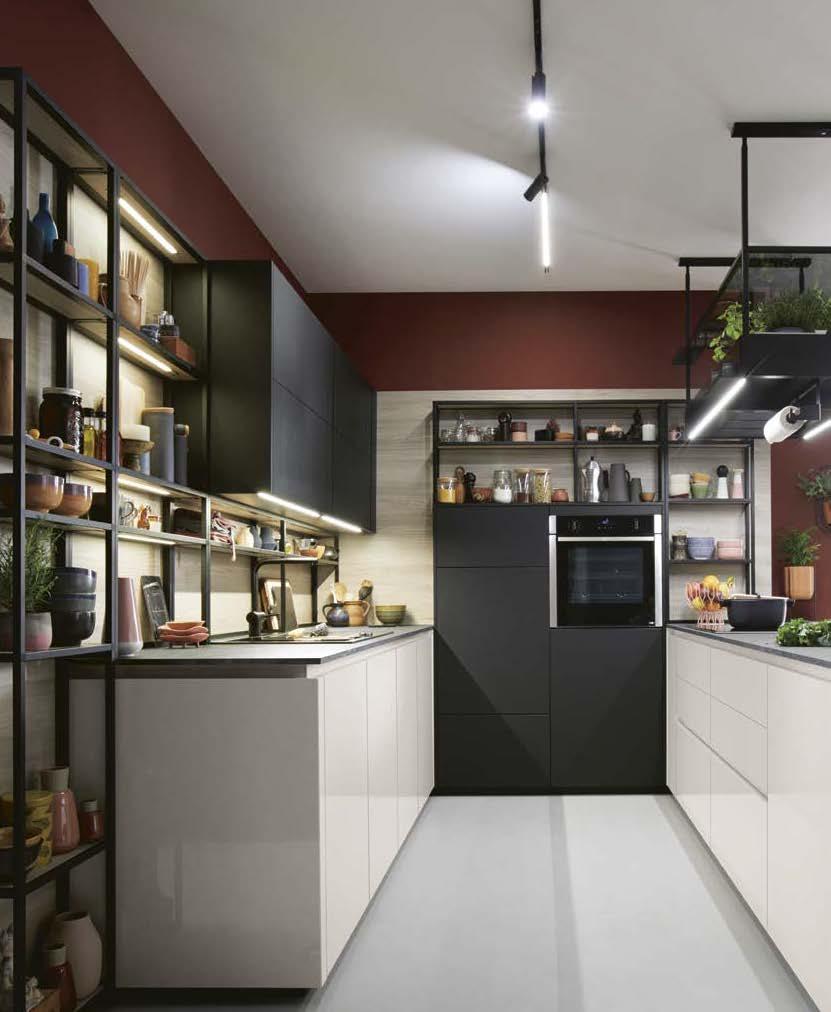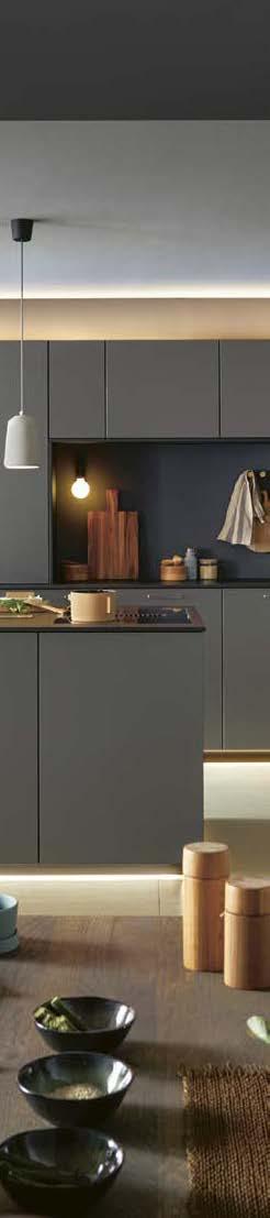 A plethora of functional highlights concealed behind an impactful façade: Matera fronts are recyclable and the new SingleX partitioning gives the base units a minimalist look with maximum impact. The bottom drawers boast the ergonomic Tip-On opening system, whilst the top ones are fitted with a subtle grip ledge profile under the worktop. They blend perfectly into the harmonious overall appearance, which is made all the more tranquil by the illuminated support panel top shelf in place of wall units. And there’s still plenty of storage space: the floorto-ceiling tall units are adapted to the room, whilst the cupboard with its roller-shutter enables optimum use to be made of the corner of this L-shaped kitchen.