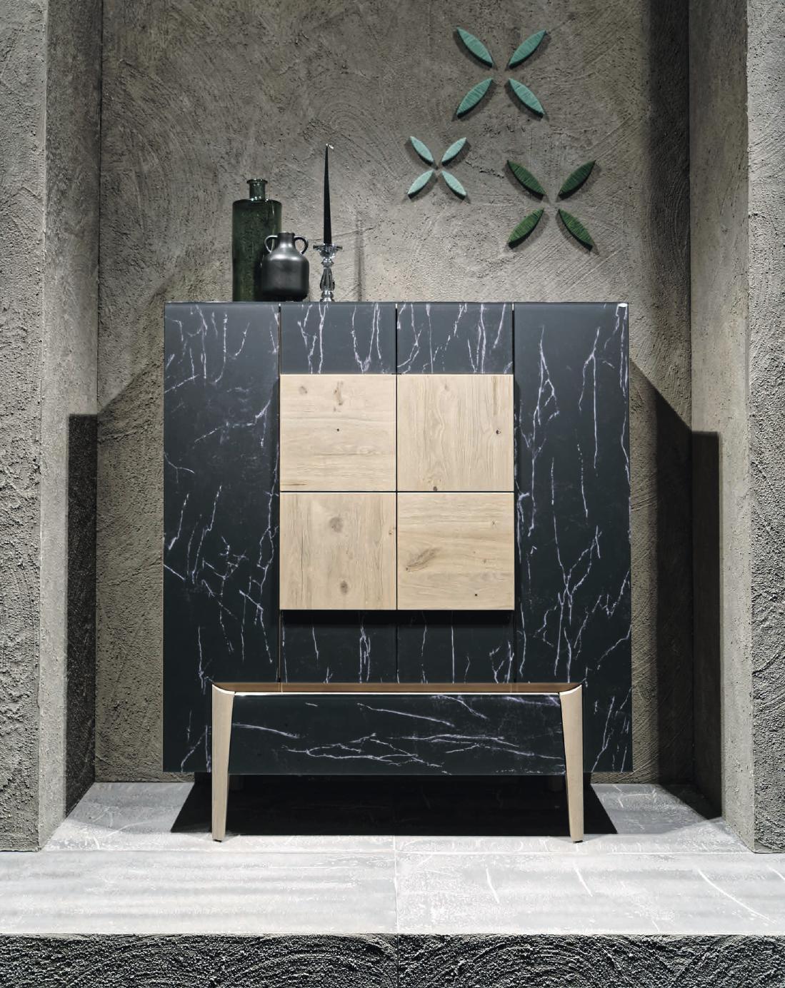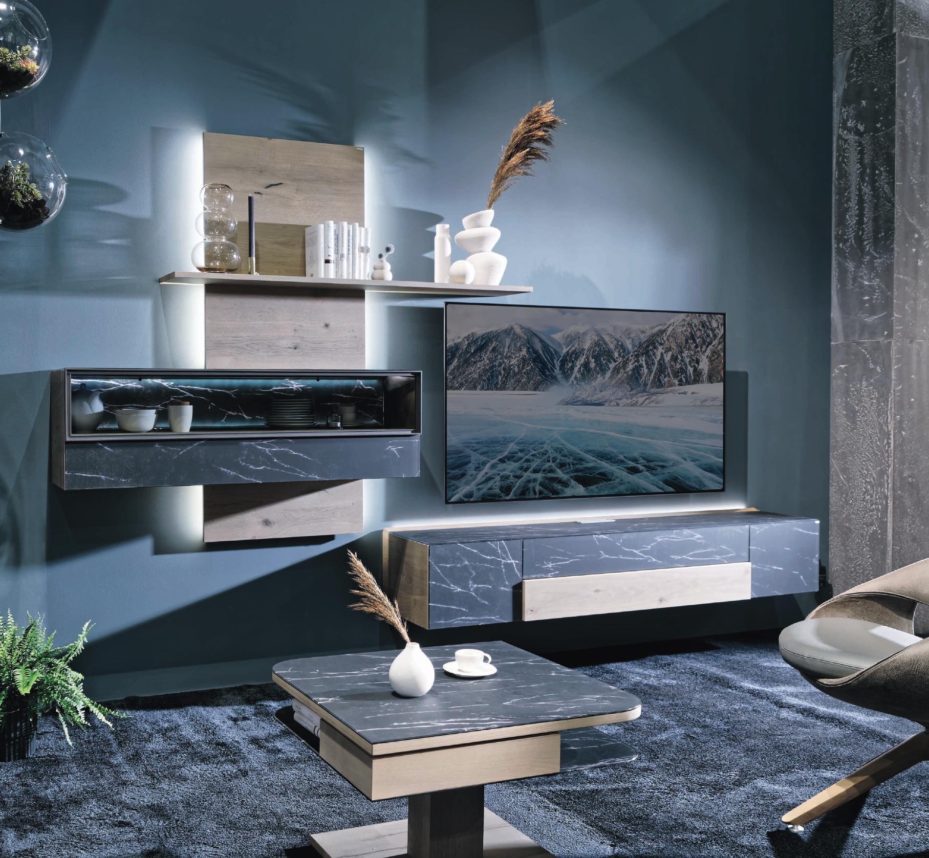 Die neue Kollektion Vtektura zeigt eine starke Hingabe an den alpinen Markenkern und zeichnet sich bei den Korpusmöbeln durch die Verwendung von pigmentiertem Glas aus, das an die Struktur eines Gletschers erinnert.