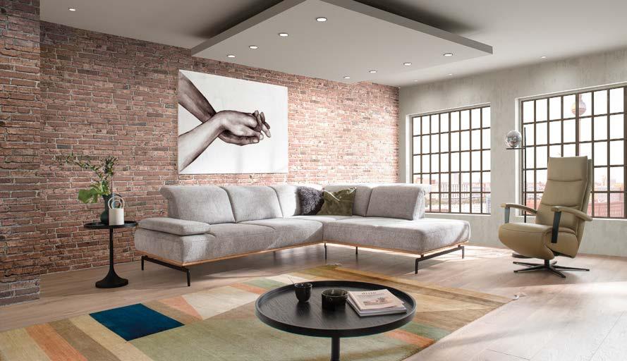 Eckkombination BRONSON in Stoff; ca. 297 x 245 cm; inkl. 5x Kopfteilverstellungen; Klapparmlehne; 3 x Sitztiefenverstellungen; Holzrahmen in Eiche geölt; filigrane Metall-Kufe schwarz; Kissen sind Deko
