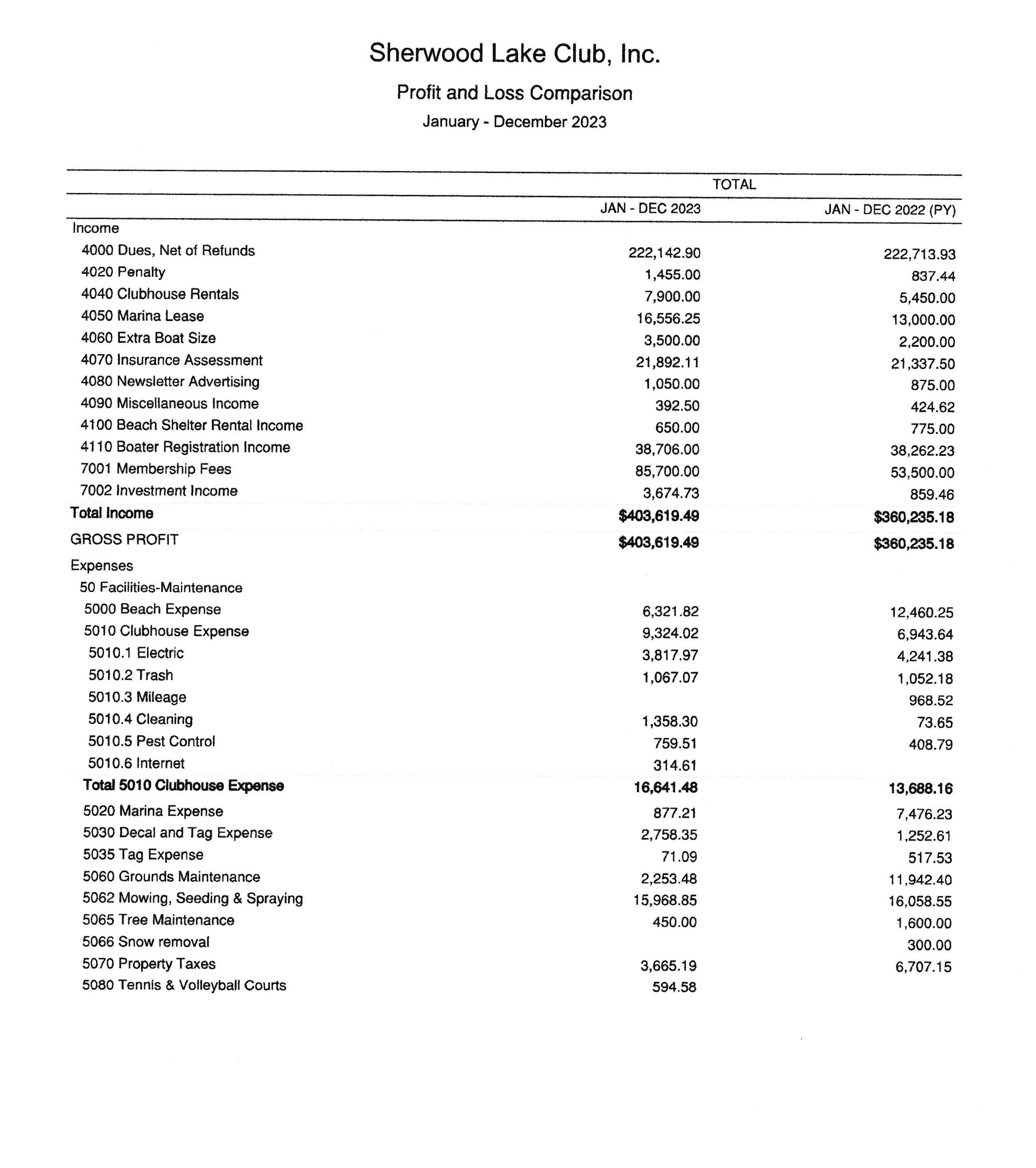 The Sherwood Lake Club, Inc. Annual Meeting was held January 23, 2024, with a full house of members in attendance. Concerns centered around the financial issue with a former employee, the water level of the lake and the ongoing saga of the dam and spillways.