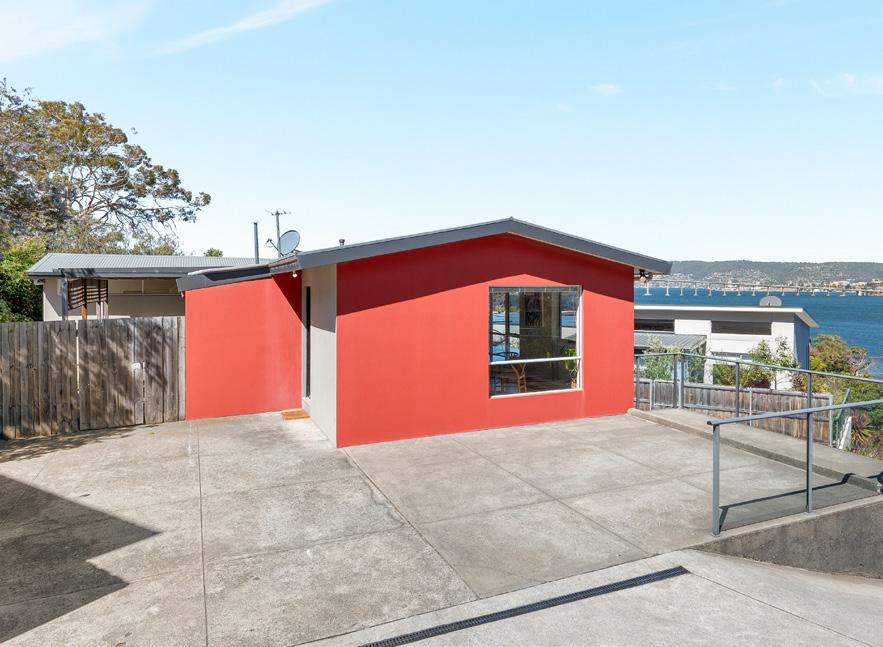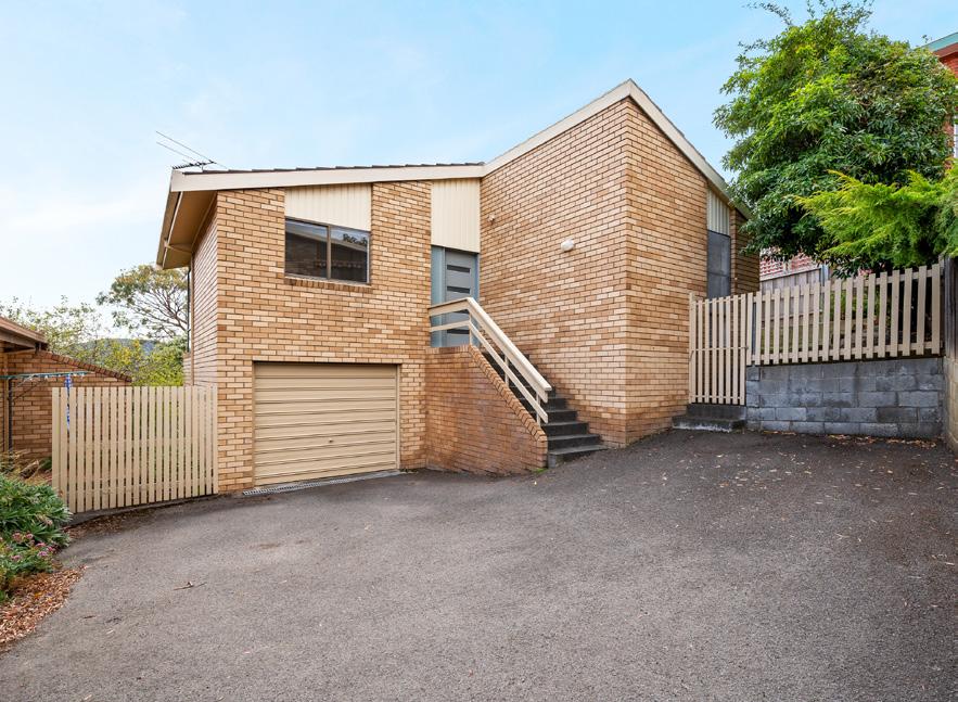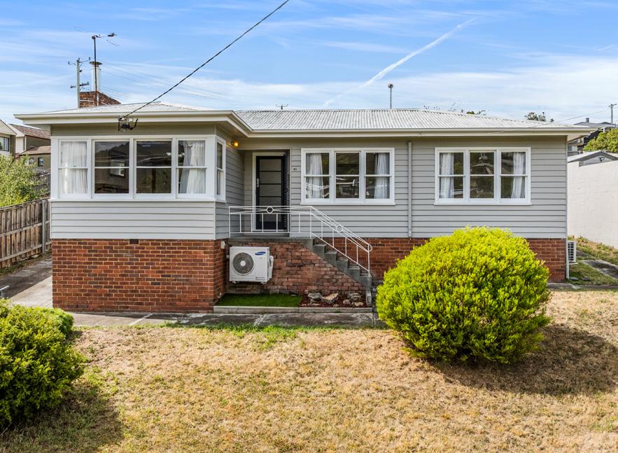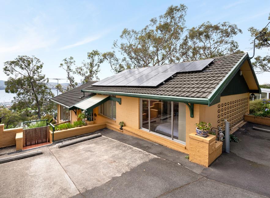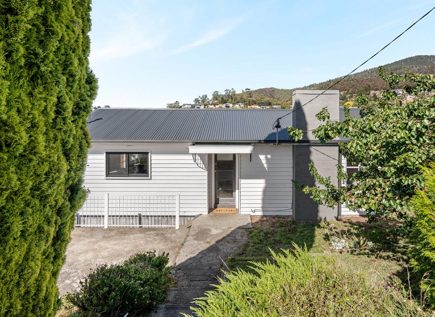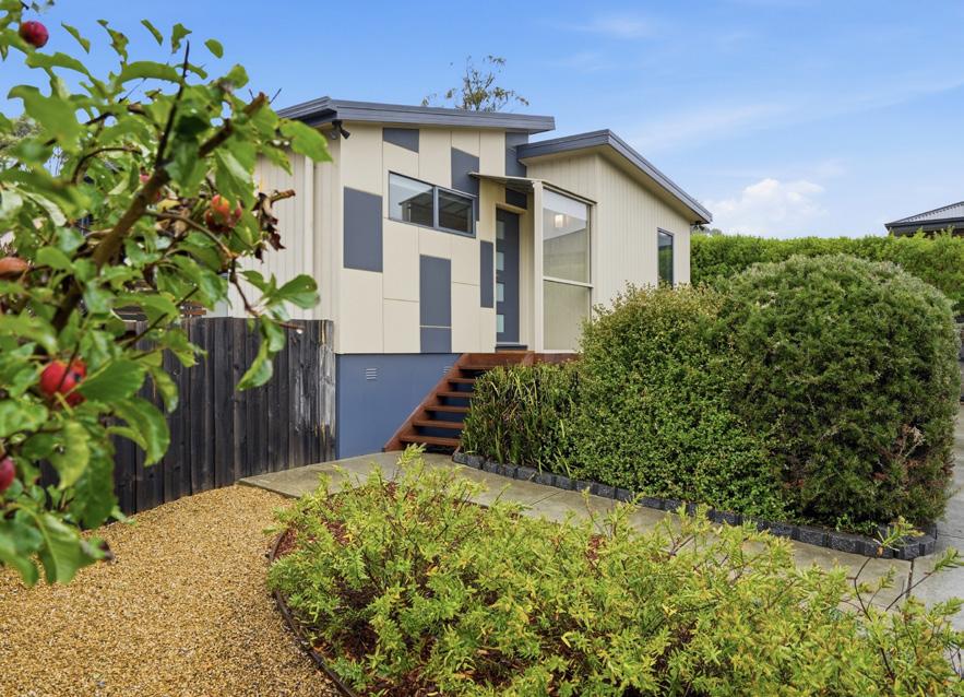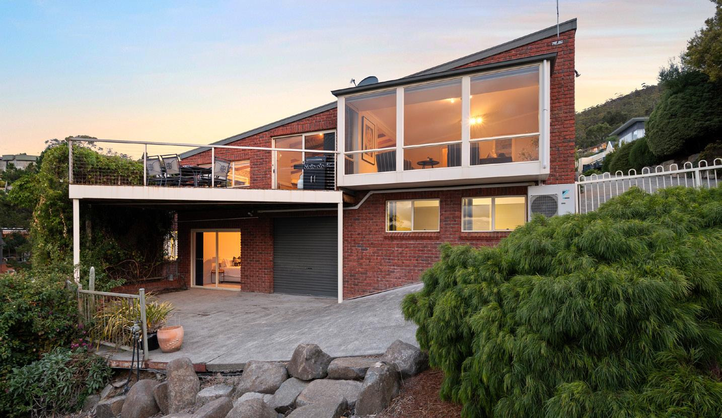 Upstairs, the home connects beautifully to its outdoor spaces. A large front deck captures the view, creating an elevated vantage point across Hobart, while to the rear, a substantial entertaining deck with covered seating provides a private and sheltered space for yearround use. Terraced gardens add further depth and usability to the outdoor setting.