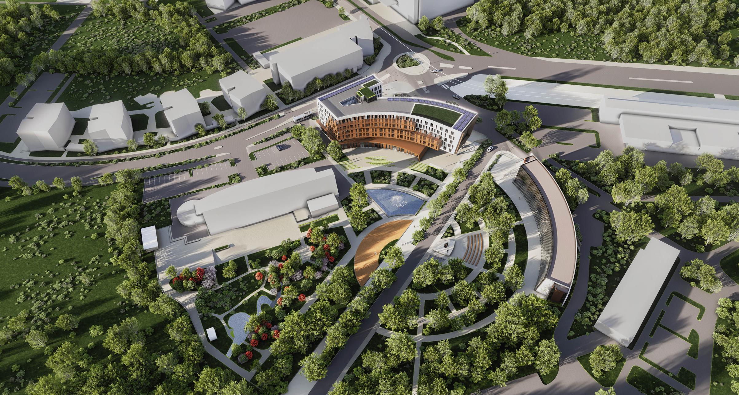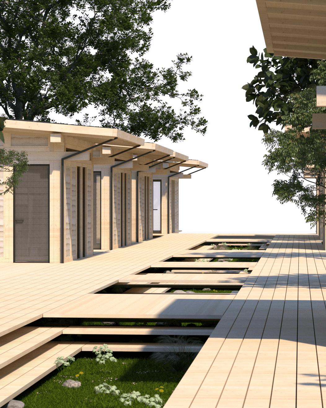 The surroundings are terraced to shape public/private zones in front of the houses. A podium separates the main walkable areas from ground level.