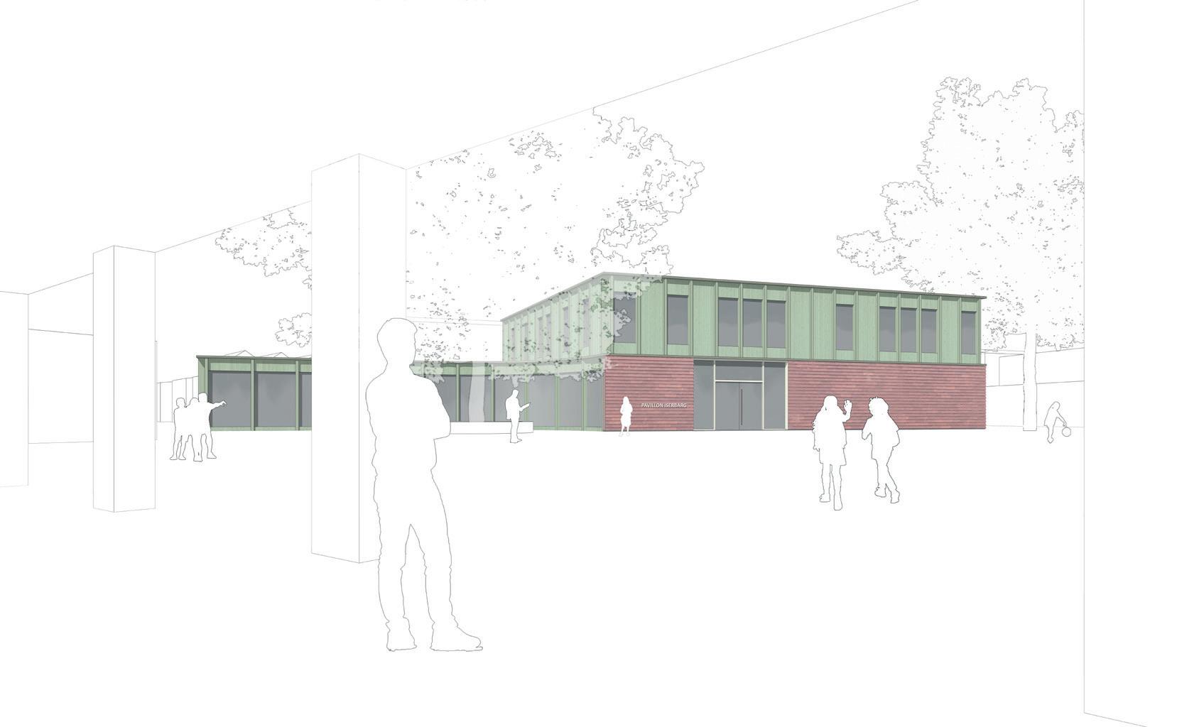 Das neue Pavillion richtet sich in der bestehenden Struktur zu dem Außenspielplatz, hauptsächltit aber gegenüber zu einer denkmalgeschützten Klinkerfassade. Als Reaktion steht bei dem entworfenen Haus der Klinkersockel, der die Materialität des gesamten Schulareals folgt. Das Thema des Holzs auf der Fassade hat einen Zusammenhang nicht nur mit der Umgebung, sondern auch mit dem Tragwerkstyp, der als Holzbau vorgesehen wurde. Die Position des Hauses hat eine Vorstudie vorgegeben, seine Form reagiert aber stark auf die schützenswerten Bäume auf dem Gelände. Zu einem der Bäume orientiert sich die Glassfassade im Erdgeschoss mit einer Mensa. Die Rundung der Fassade bietet an dieser Stelle schöne Interaktionen an - von passiver Beobachtung von drinnen zur aktiven Unterhaltung auf der Sitzbank rund um den Baumstamm. Die beschriebene untere Ebene mit Mensa ergänzt ein rationeller Block mit 4 Klassen.