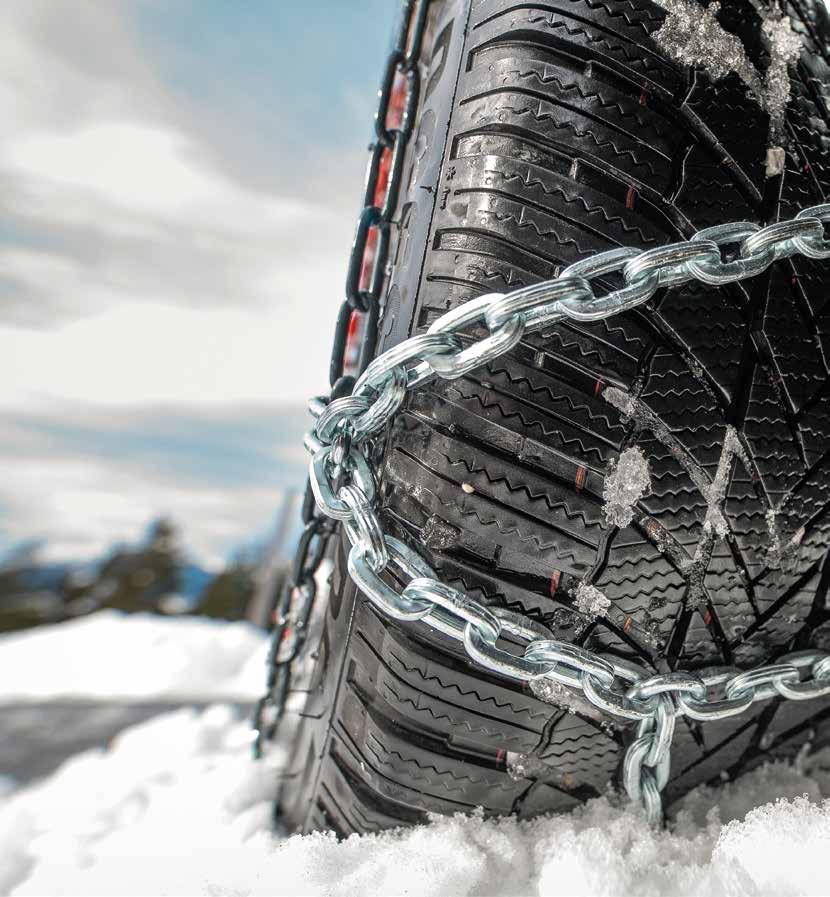 • Montez les chaînes à temps lorsque la route est enneigée, en cas de verglas ou lorsque les chaînes à neige sont obligatoires - vaut également pour les véhicules à quatre roues motrices
