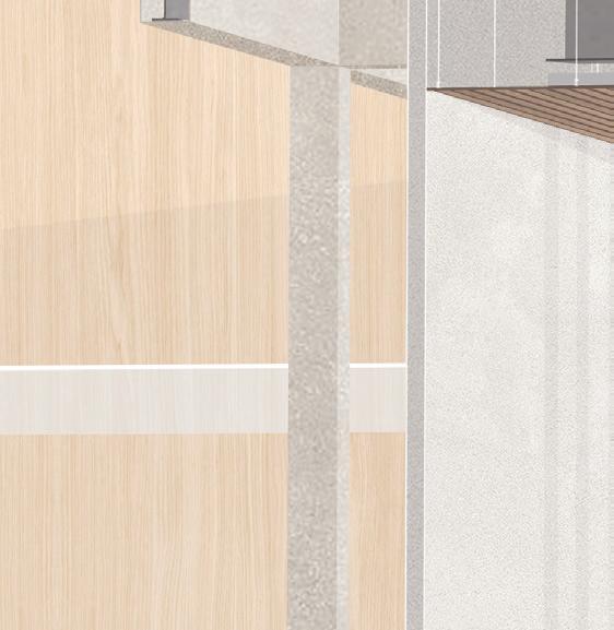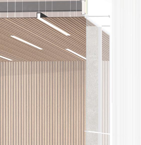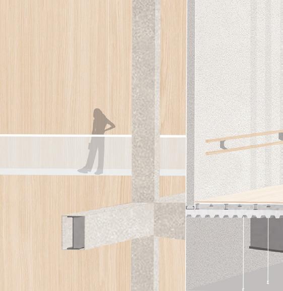 (ABOVE) 2D WALL SECTION DETAIL | The intricate nature of the wall section provides insight into the structural assembly of the rehearsal studio space in relation to the central atrium. The incorporation of design specifications and the layering of materials clarifies the interaction between different components, revealing how they come together to support the overall design.