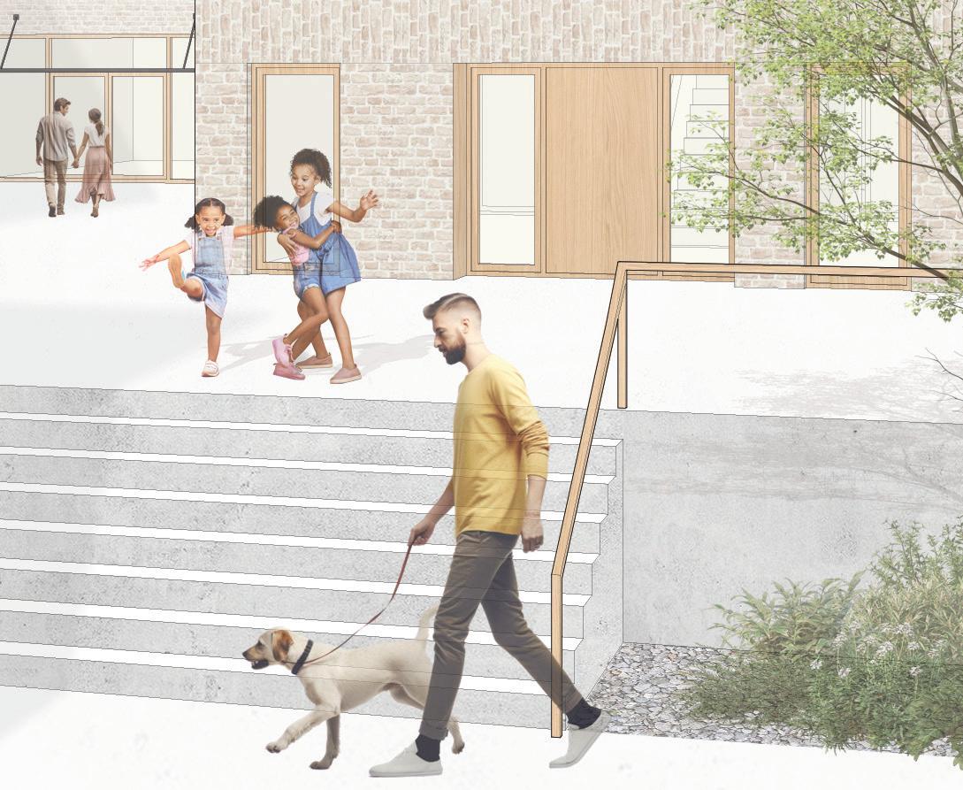 Public spaces, such as community classrooms and a café, are placed along the active side of the site, while private amenities like a gym and game lounge are reserved for residents.