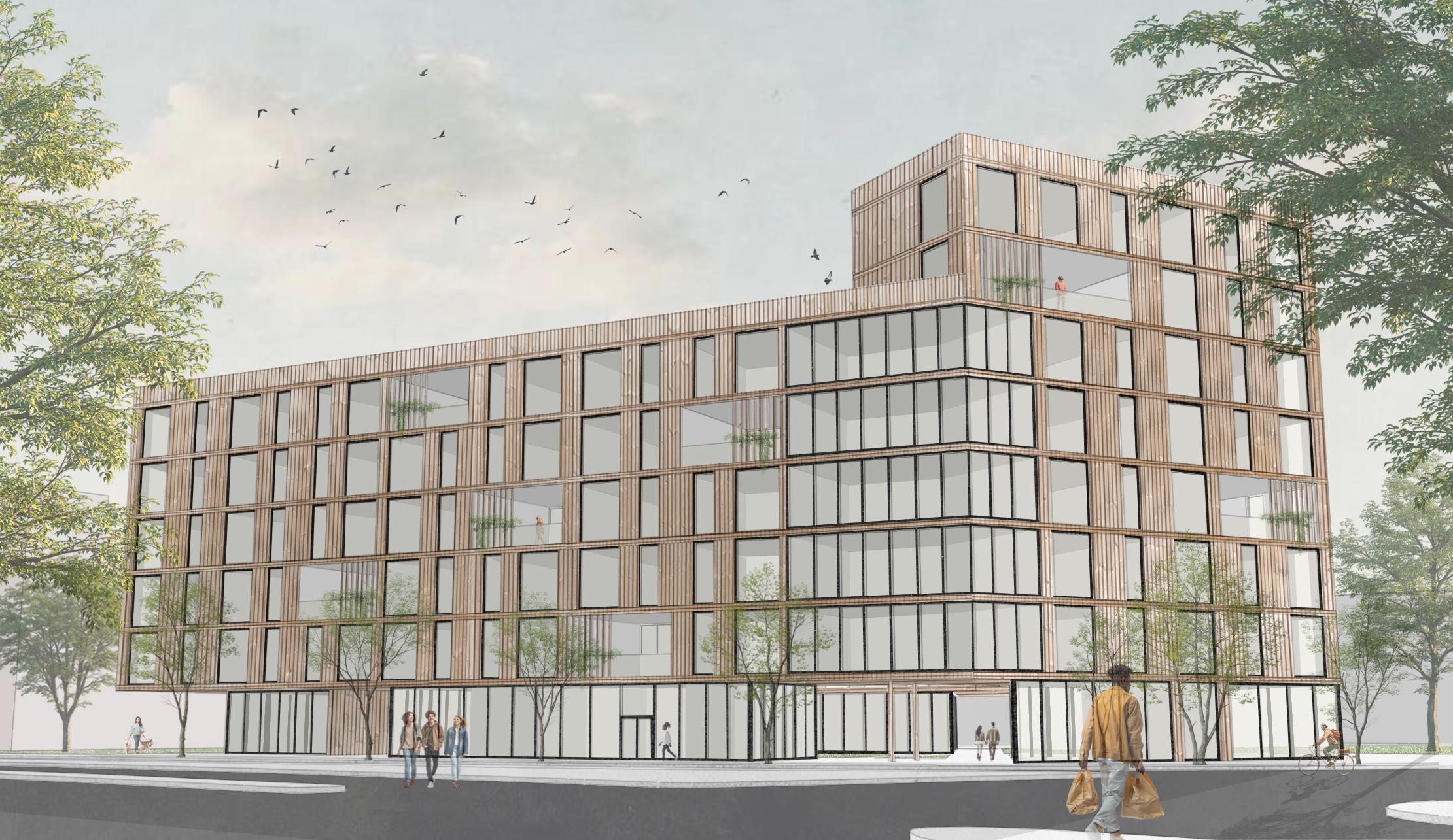 Residential units are strategically placed: studio and one bedroom apartments face the street, while larger two and three bedroom units are located on the innermost side of the site. Indoor lounges and outdoor balconies promote interaction across residential floors.Learning the design capabilities and benefits of mass timber products was a fundamental part of this project, using cross-laminated timber panels and gluelaminated columns and beams. The exposed mass timber and exterior wood cladding create a warm, inviting aesthetic. Large windows and open corners highlighted by overhangs enhance transparency and foster communal connectivity.