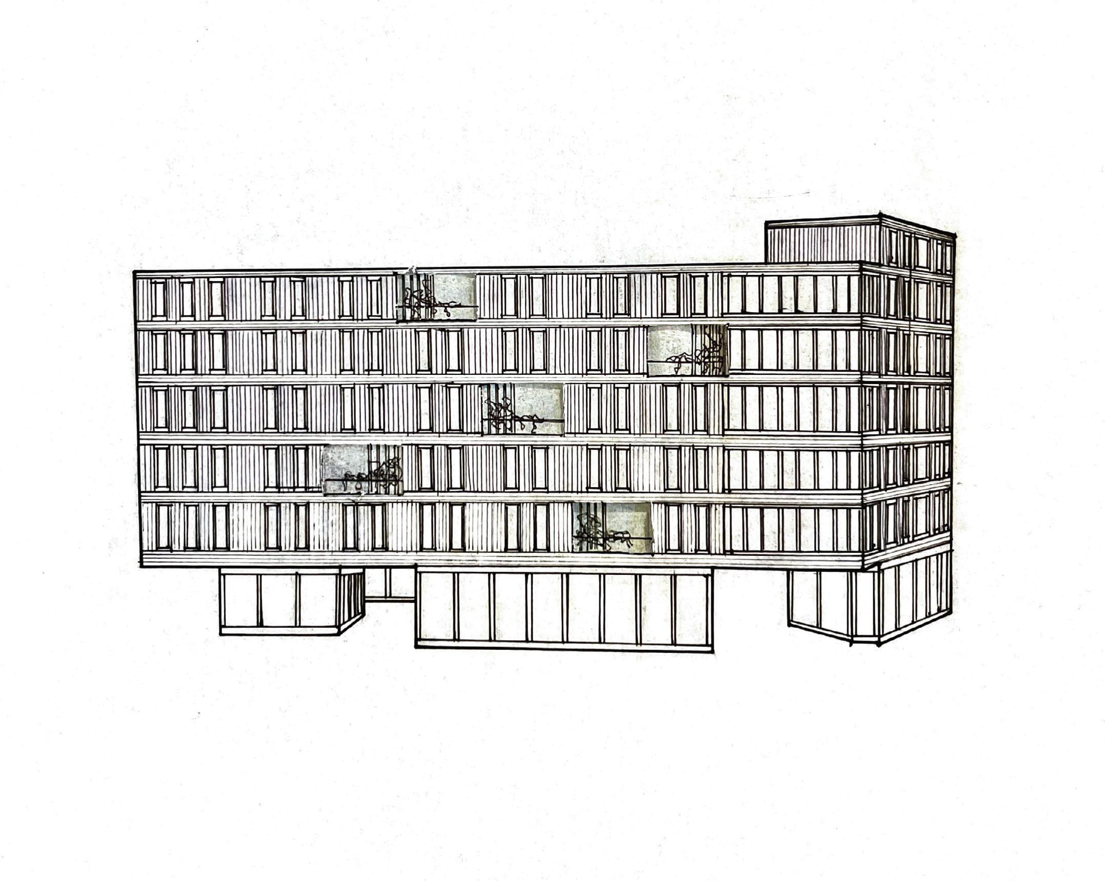 (RIGHT) PROCESS DRAWING | This hand drawing illustrates the interaction between the open, public ground floor and the private residential levels above. The wood cladding on the facade reflects the mass timber construction, with alternating orientations that correspond to the floor panels between each level.
