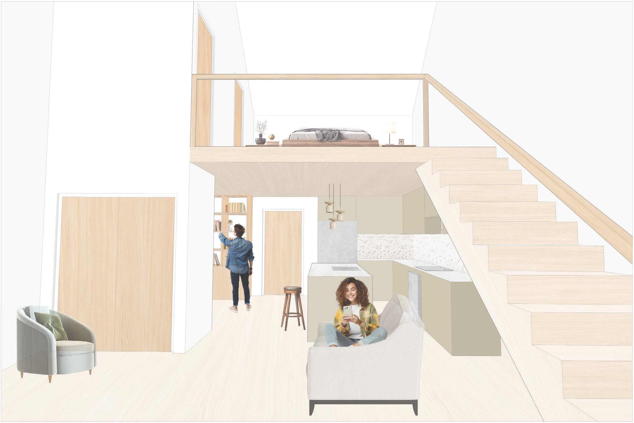 (ABOVE) ONE BED INTERIOR PERSPECTIVE | The one bedroom interiors feature a loft that reflects the project’s theme of level changes. The space showcases wood accents and exposed CLT elements, highlighting its construction and creating a warm, natural, and comfortable environment.