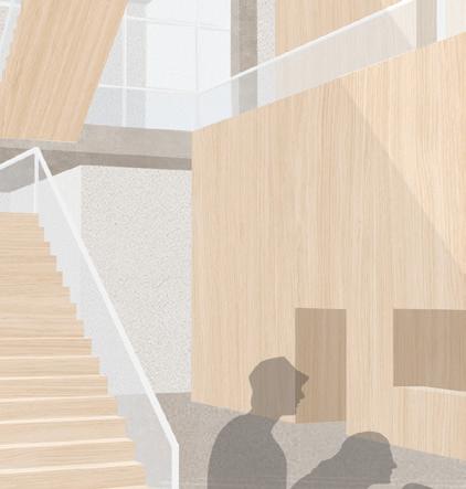 (ABOVE) INTERIOR PERSPECTIVE | This perspective of the central atrium highlights the interconnection of multiple levels and spaces, emphasizing the expansive and inviting atmosphere designed for social interaction and gathering. The dynamic play of light,