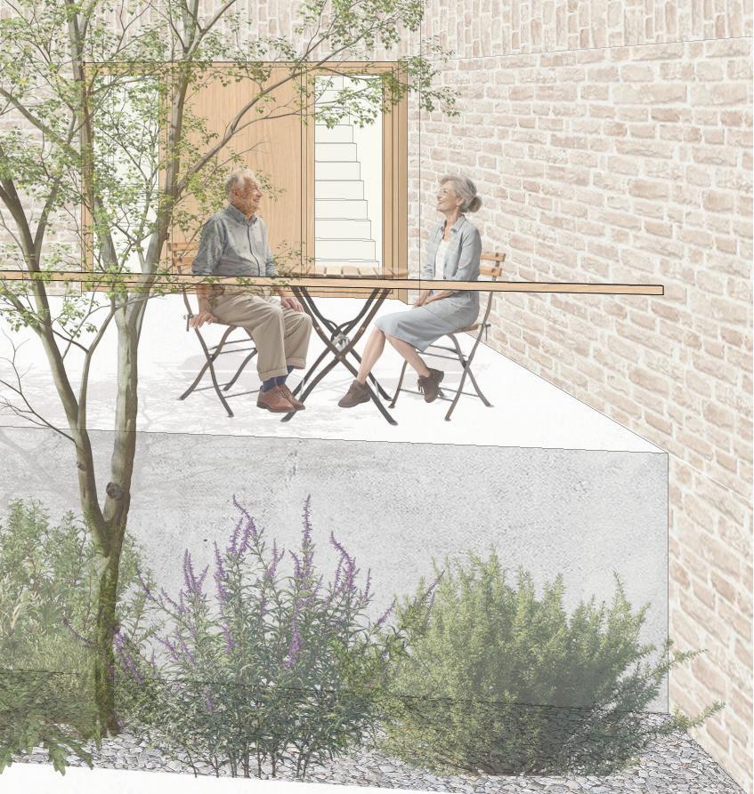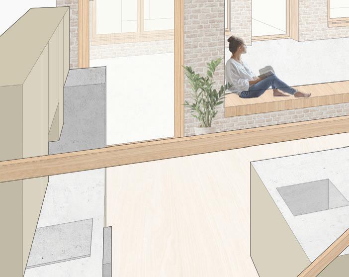 (ABOVE) TWO BED INTERIOR PERSPECTIVE | This view highlights the split-level interior, which is designed to address the level difference on both sides of the townhome and features the built-in window seat found in each unit for residents to relax and engage with the outdoors.