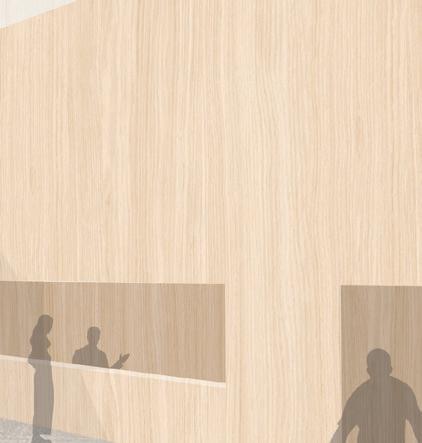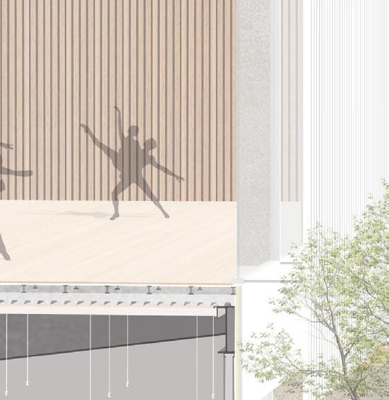 (ABOVE) 3D SECTION PERSPECTIVE | This perspective reveals the assembly of the structure, highlighting the intersection of the rehearsal studios with the central mass of the atrium. The perspective emphasizes the flow between indoor and outdoor spaces through the pivoting doors, which visually connect the two environments. It also provides insight into the various activities taking place within the distinct spaces, offering a comprehensive understanding of the spatial relationships and movement within the building.
