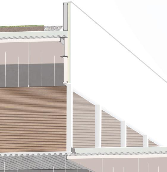 (ABOVE) STREET ELEVATION | The street view highlights the ground-level retail storefronts in relation to the one bedroom apartments and rooftop patio above. The lofted one bedroom apartments on the top floor feature skylights for added light and visual interest. 6 12 18 24 3