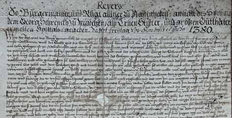 Auszug aus dem Revers des Jahres 1380 mit der Beschreibung der ursprünglichen Spitalbesitzungen des Marktes Pfaffenhofen (Stadtarchiv Pfaffenhofen Nr. 4155)