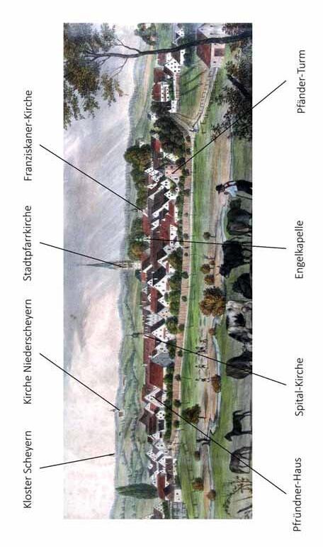 1814 veröffentlichte der bayerische Historiker Felix Joseph von Lipowsky (1764–1842) einen Kalender für das Folgejahr, der an das Bürgermilitär gerichtet war, das „Nazional Garde Jahrbuch für das Königreich Baiern“ 1815. Darin enthalten waren auch sechs Kupferstiche mit Ansichten. Kurioserweise findet sich die Ansicht von Pfaffenhofen zwischen den Seiten 4 und 5 ganz zu Beginn des Buchs im Kapitel „Historische Notizen“ in einem Abschnitt in dem es um antike, römische Geschichte geht. Geschaffen hat die Ansicht der Kupferstecher Paul Jakob Laminit (1773–1831), dessen Talent Lipowsky in seinen Personenlexika mit folgenden Worten lobte: … in meinem Bürgermilitär-Almanach sieht man mehrere Städte und Landschaften in Kupfer gestochen, die seiner Kunst alle Ehre machen. In dem Bild aus nördlicher Perspektive sind die zuvor stadtbildprägenden, geschmückten Giebel von Rentamt und Großem Stadthaus verschwunden. Die Spitalkirche ist links noch klar an ihrem Dachreiter zu erkennen. Allerdings diente sie zu diesem Zeitpunkt bereits als Schrannenhalle, also als Getreidelager. Der Spitalbetrieb war ins ehemalige Franziskaner-Kloster, rechts neben der Stadtpfarrkirche, übersiedelt worden.