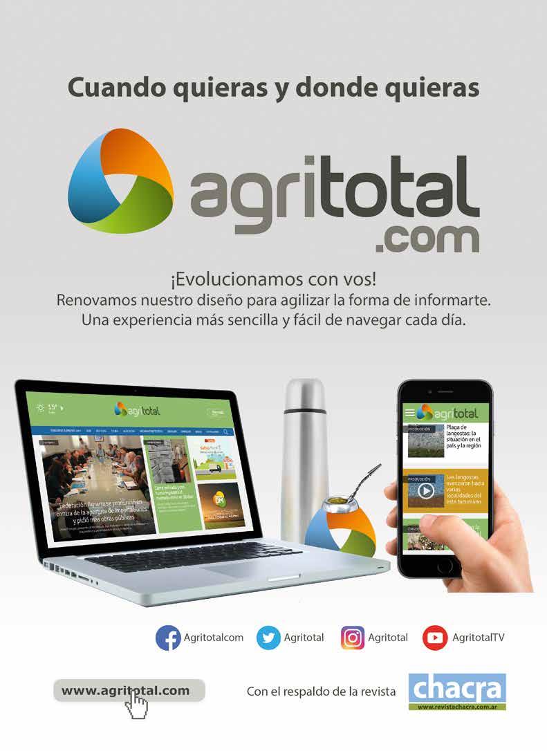 CHACRA & CAMPO MODERNO. Fundada en noviembre de 1930, es propiedad de The New Farm Company S.A., Francisco Narciso de Laprida 1481 - Vicente López, Buenos Aires, Argentina. Tel. 011-5353-5090 al 94; PUBLICACIÓN MENSUAL. Precio del ejemplar en todo el país: $ 300,00. Recargo por envío al interior: $ 16,00. SUSCRIPCIONES. En el exterior con franqueo vía aérea certificado. Países limítrofes (Bolivia, Brasil, Chile, Paraguay, y R. O. del Uruguay) y Perú: 1 año (12 números) USD 170 -Resto de América: USD 250- Europa: USD 270 - Asia, África y Oceanía: USD 270- Distribuidora en Capital Federal y Gran Buenos Aires: Huesca-Distribuidora de Publicaciones S.A., Aristóbulo del Valle 1556, Cap. Fed. Distribuidor en el interior del país: Transpres S.A., Isabel La Católica 1371, Cap. Fed. Registro Nacional de la Propiedad Intelectual 512 1483. Impresa en MARIANO MAS S.A. - México 649/651, San Telmo. Buenos Aires, Argentina - Teléfono: (+54 11) 4331-5764. Este medio se encuentra auditado por el Instituto Verificador de Circulaciones (IVC). PRINTED IN ARGENTINA. ISSN 0325-7932. Editor Responsable: RUBÉN O. BARTOLOMÉ. BUENOS AIRES - JULIO 2024 - AÑO 94 EDICIÓN Nº 1124