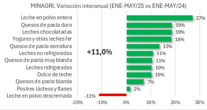 Este diferencial no es casual. Los productos destinados al consumo local, como leche fluida, quesos frescos y yogures, se comercializan en segmentos de mayor valor agregado y llegan al consumidor final con una estructura de precios más sólida que la inestable dinámica de los commodities internacionales. Es interesante observar cómo han crecido un 11% en equivalente litros de leche las ventas al mercado interno (ver gráfico correspondiente) en el período enero a mayo de 2025 versus el mismo lapso de 2024. Salvo la leche en polvo descremada, todos los productos crecieron, incluyendo los más caros como yogures y postres.